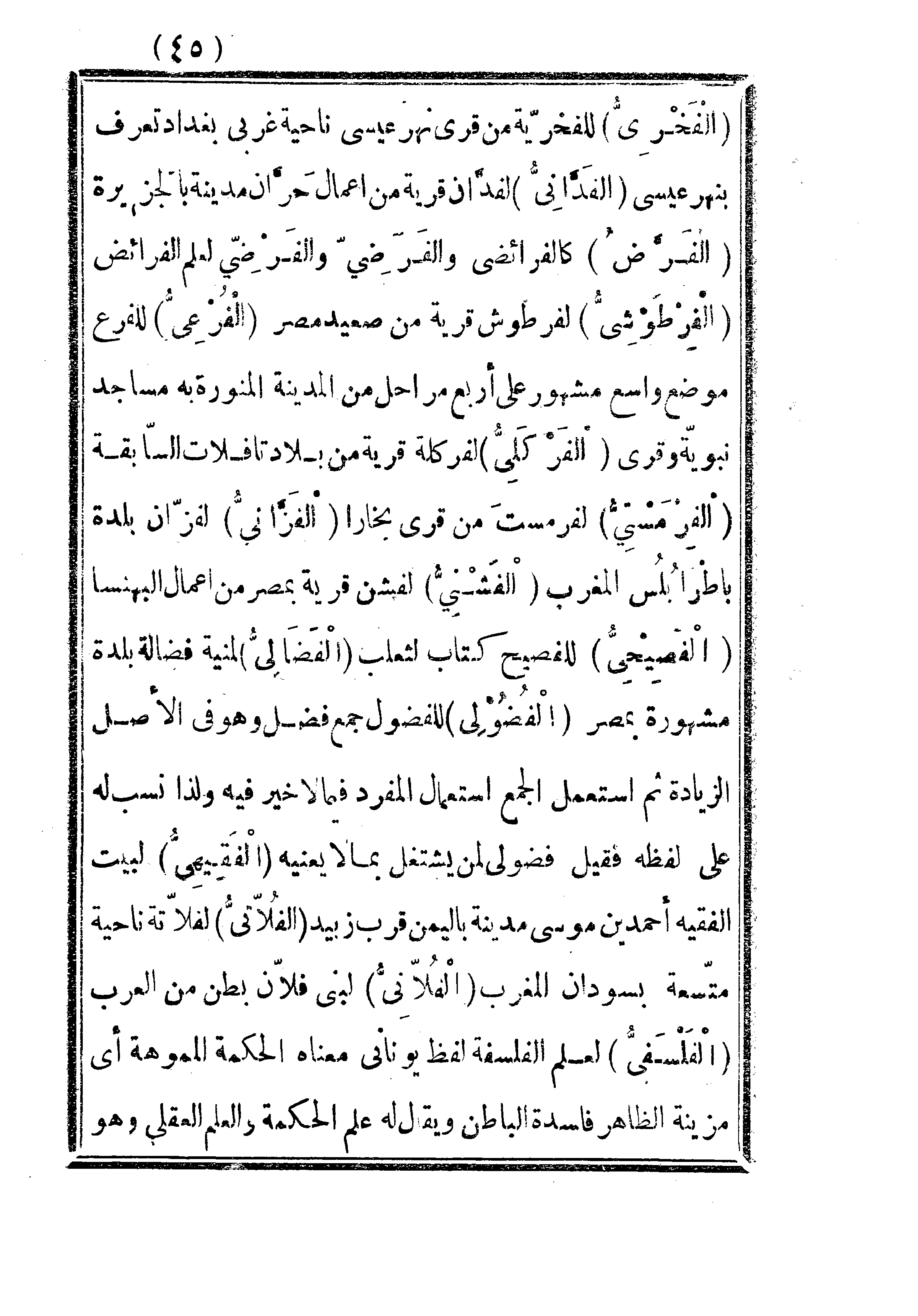 الفخري: للفخرية من قرى نهر عيسى ناحية غربي بغداد تعرف بنهر عيسى. الفداني: لفدان قرية من أعمال حران مدينة بالجزيرة. الفراض: كالفرائضي والفرضي والفرضي لعلم الفرائض. الفرطوشي: لفرطوش قرية من صعيد مصر. الفرعي: للفرع موضع واسع مشهور على أربع مراحل من المدينة المنورة به مساجد نبوية وقرى. الفركلي: لفركلة قرية من بلاد تافلات السابقة. الفرمسي: لفرمست من قرى بخارا. الفزاني: لفزان بلدة بأطرابلس المغرب. الفشني: لفشن قرية بمصر من أعمال البهنسا. الفصيحي: للفصيح كتاب لثعلب. الفضالي: لمنية فضالة بلدة مشهورة بمصر الفضولي للفضول جمع فضل وهو في الأصل الزيادة ثم استعمل الجمع استعمال المفرد فيما فيه ولذا نسب له على لفظه فقيل فضولي لمن يشتغل بما لا يعنيه. الفقيهي: لبيت الفقيه أحمد بن موسى مدينة باليمن قرب زبيد. الفلاتي: لفلاتة ناحية متسعة بسودان المغرب. الفلاني: لبني فلان بطن من العرب. الفلسفي: لعلم الفلسفة لفظ يوناني معناه الحكمة المموهة أي مزينة الظاهر فاسدة الباطن ويقال له علم الحكمة والعلم العقلي وهو
