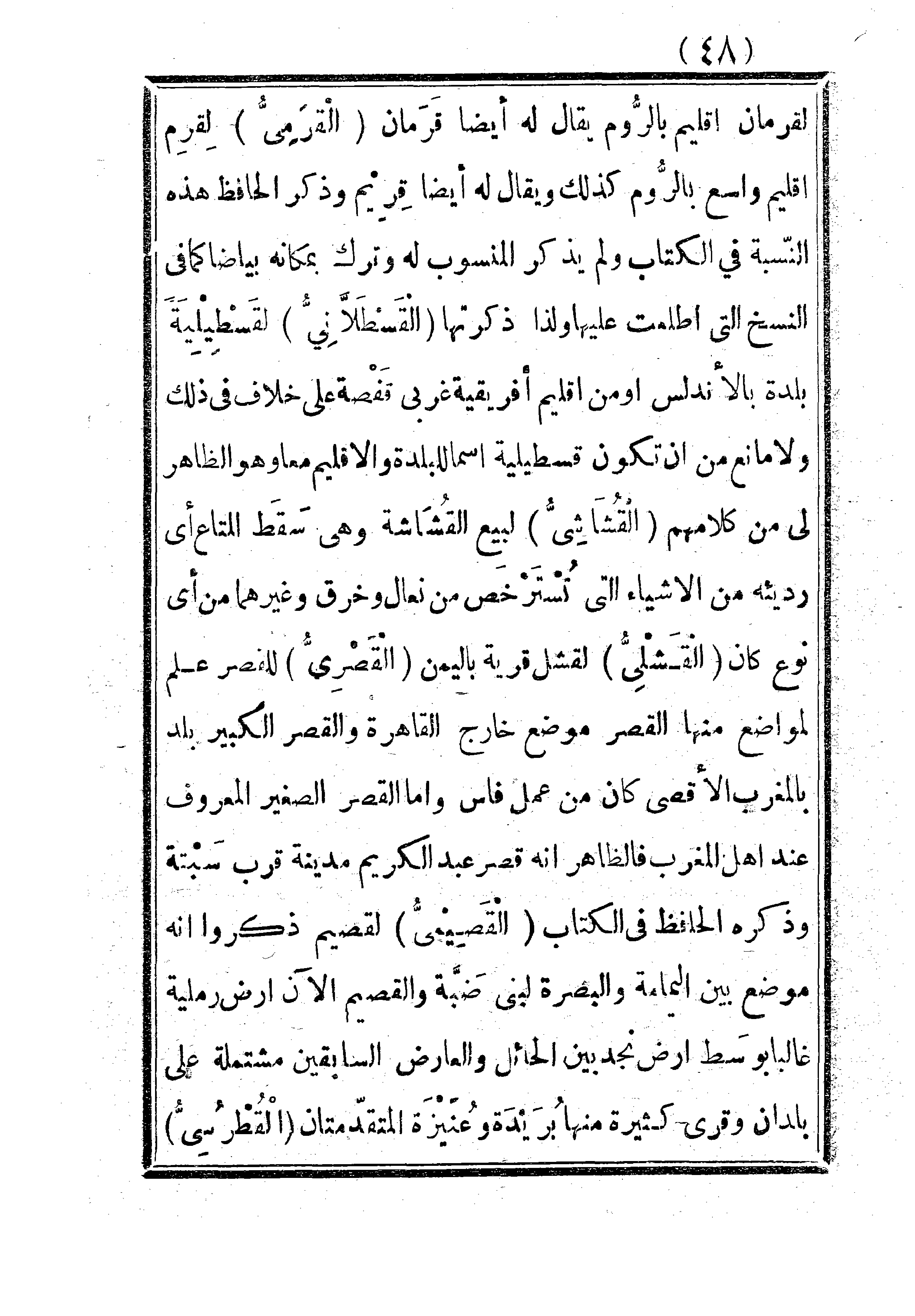 لقرمان إقليم بالروم ويقال له أيضاً قرمان. القرمي: لقرم إقليم واسع بالروم وكذلك ويقال له أيضاً قريم وذكر الحافظ هذه النسبة في الكتاب ولم يذكر المنسوب له وترك بمكانه بياضاً كما في النسخ التي اطلعت عليها ولذا ذكرتها. القسطلاني: لقسطيلية بلدة بالأندلس أو من إقليم إفريقية غربي قفصة على خلاف في ذلك ولا مانع من أن تكون قسطيلية اسماً للبلدة والإقليم معاً وهو الظاهر لي من كلامهم. القشاشي: لبيع القشاشة وهي سقط المتاع أي رديئه من الأشياء التي تسترخص من نعال وخرق وغيرهما من أي نوع كان. القشلي: لقشل قرية باليمن. القصري: للقصر علم لمواضع منها القصر موضع خارج القاهرة والقصر الكبير بلد بالمغرب الأقصى كان من عمل فاس وأما القصر الصغير المعروف عند أهل المغرب فالظاهر أنه قصر عبد الكريم مدينة قرب سبتة وذكره الحافظ في الكتاب. القصيمي: لقصيم ذكروا أنه موضع بين اليمامة والبصرة لبني ضبة والقصيم الآن أرض رملية غالباً بوسط أرض نجد بين الحائل والعارض السابقين مشتملة على بلدان وقرى كثيرة منها بريدة وعنبرة المتقدمان. القطرسي: