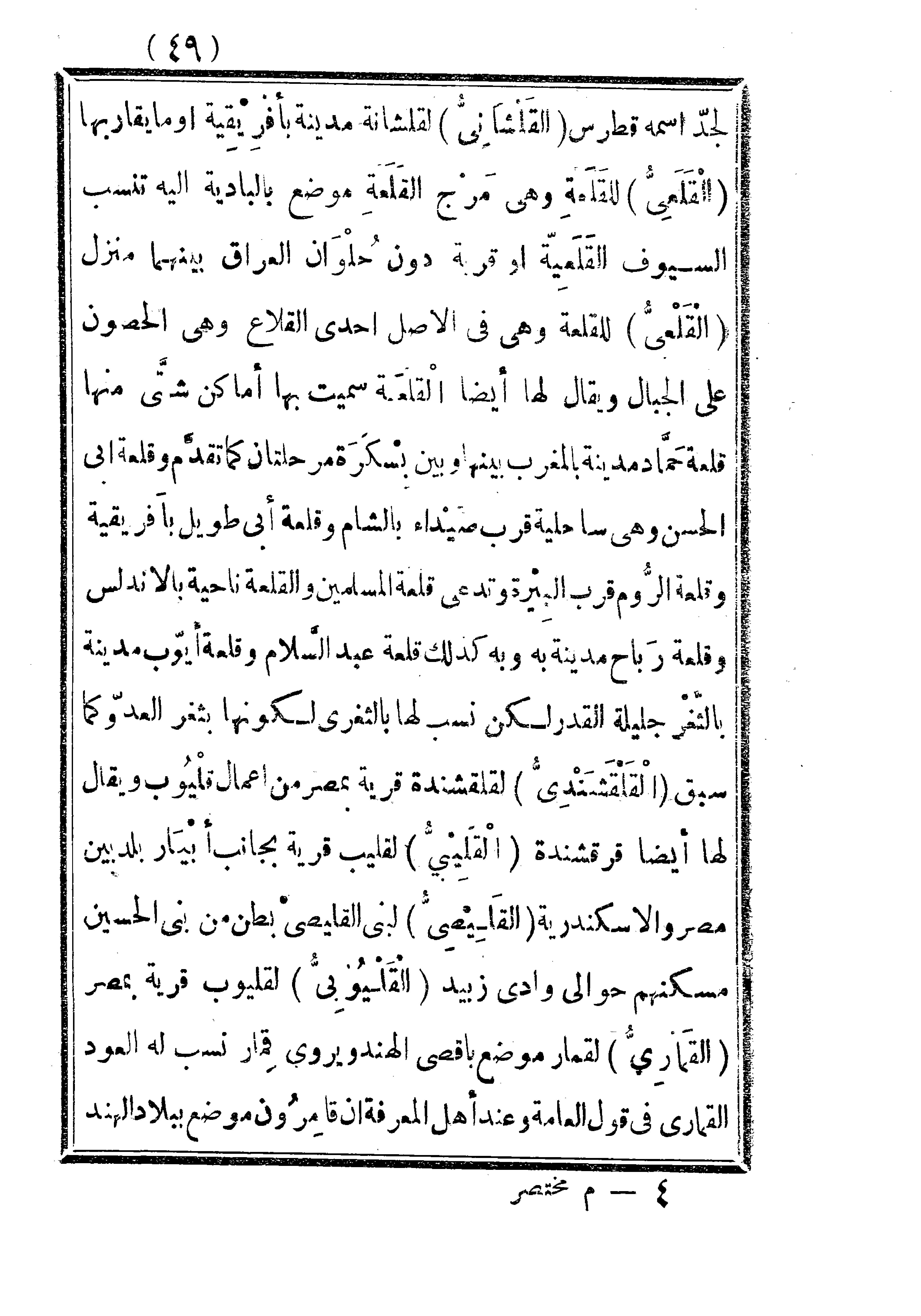 لجد اسمه قطرس. القلشاني: لقلشانة مدينة بإفريقية أو ما يقاربها. القلعي: للقلعة وهي مرج القلعة موضع بالبادية إليه تنسب السيوف القلعية أو قرية دون حلوان العراق بينهما منزل. القلعي: للقلعة وهي في الأصل إحدى القلاع وهي الحصون على الحبال ويقال لها أيضاً القلعة سميت بها أماكن شتى منها قلعة حماد مدينة بالمغرب بينها وبين بسكرة مرحلتان كما تقدم وقلعة أبي الحسن وهي ساحلية قرب صيداء بالشام وقلعة أبي طويل بإفريقية وقلعة الروم قرب البيرة وتدعى قلعة المسلمين والقلعة ناحية بالأندلس وقلعة رباح مدينة به وبه كذلك قلعة عبد السلام وقلعة أيوب مدينة بالثغر جليلة القدر لكن نسب لها بالثغري لكونها بثغر العدو كما سبق. القلقشندي: لقلقشندة قرية بمصر من أعمال قليوب ويقال لها أيضاً قرقشندة. القليبي: لقليب قرية بجانب أبيار بلد بين مصر والإسكندرية. القليصي: لبني القليص بطن من بني الحسين مسكنهم حوالي وادي زبيد. القليوبي: لقليوب قرية بمصر. القماري: لقمار موضع بأقصى الهند ويروى قمار نسب له العود القماري في قول العامة وعند أهل المعرفة إن قامرون موضع ببلاد الهند