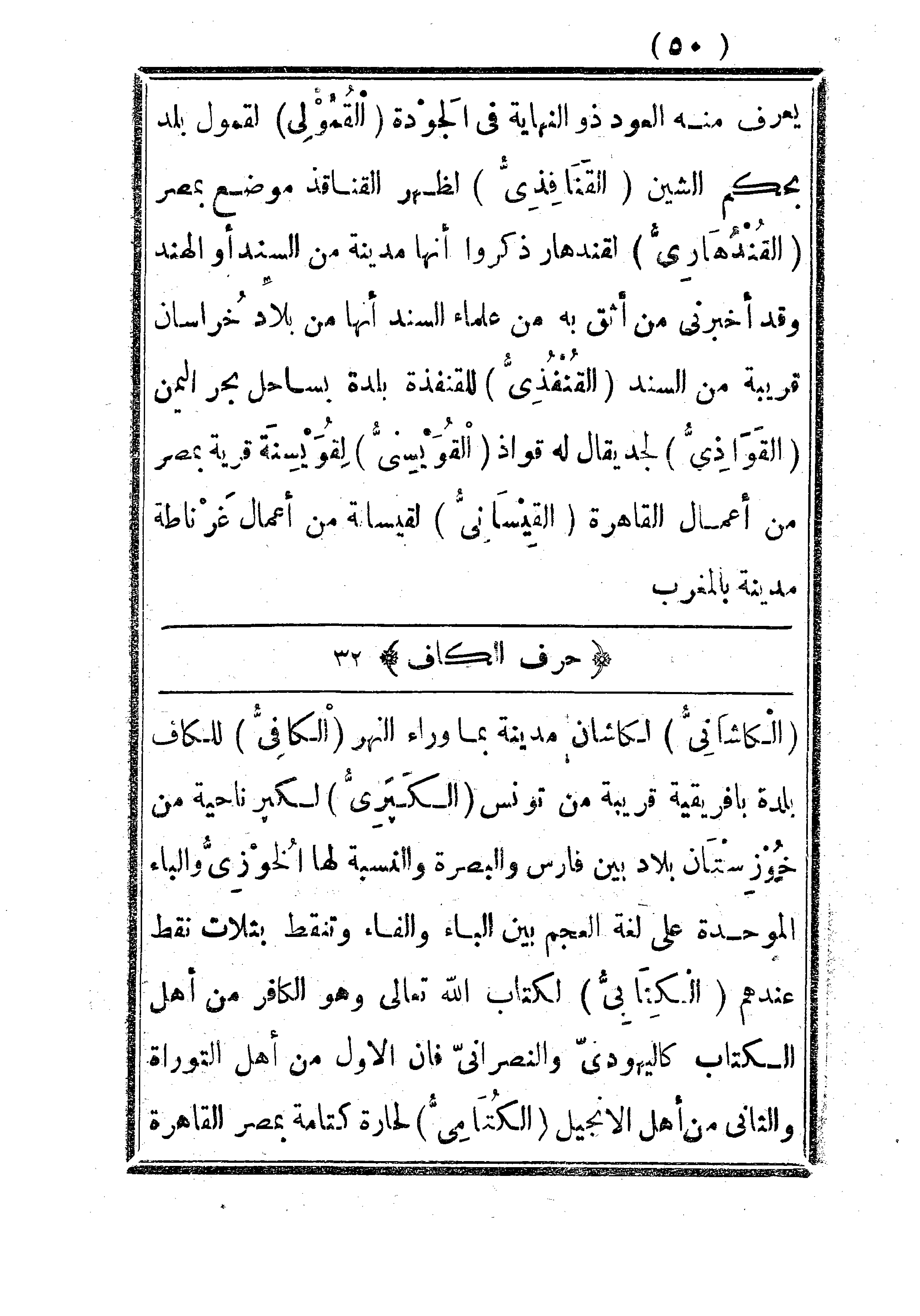 يعرف منه العود ذو النهاية في الجودة. القمولي: لقمول بلد بحكم الشين. القناافذي: لظهر القنافذ موضع بمصر. القندهاري: لقندهار ذكروا أنها مدينة من السند أو الهند وقد أخبرني من أثق به من علماء السند أنها من بلاد خراسان قريبة من السند. القفذي: للقنفذة بلدة بساحل بحر اليمن. القواذي: لجد يقال له قواذ. القويسني: لقويسنه قرية بمصر من أعمال القاهرة. القيساني: لقيسانة من أعمال غرناطة مدينة بالمغرب.