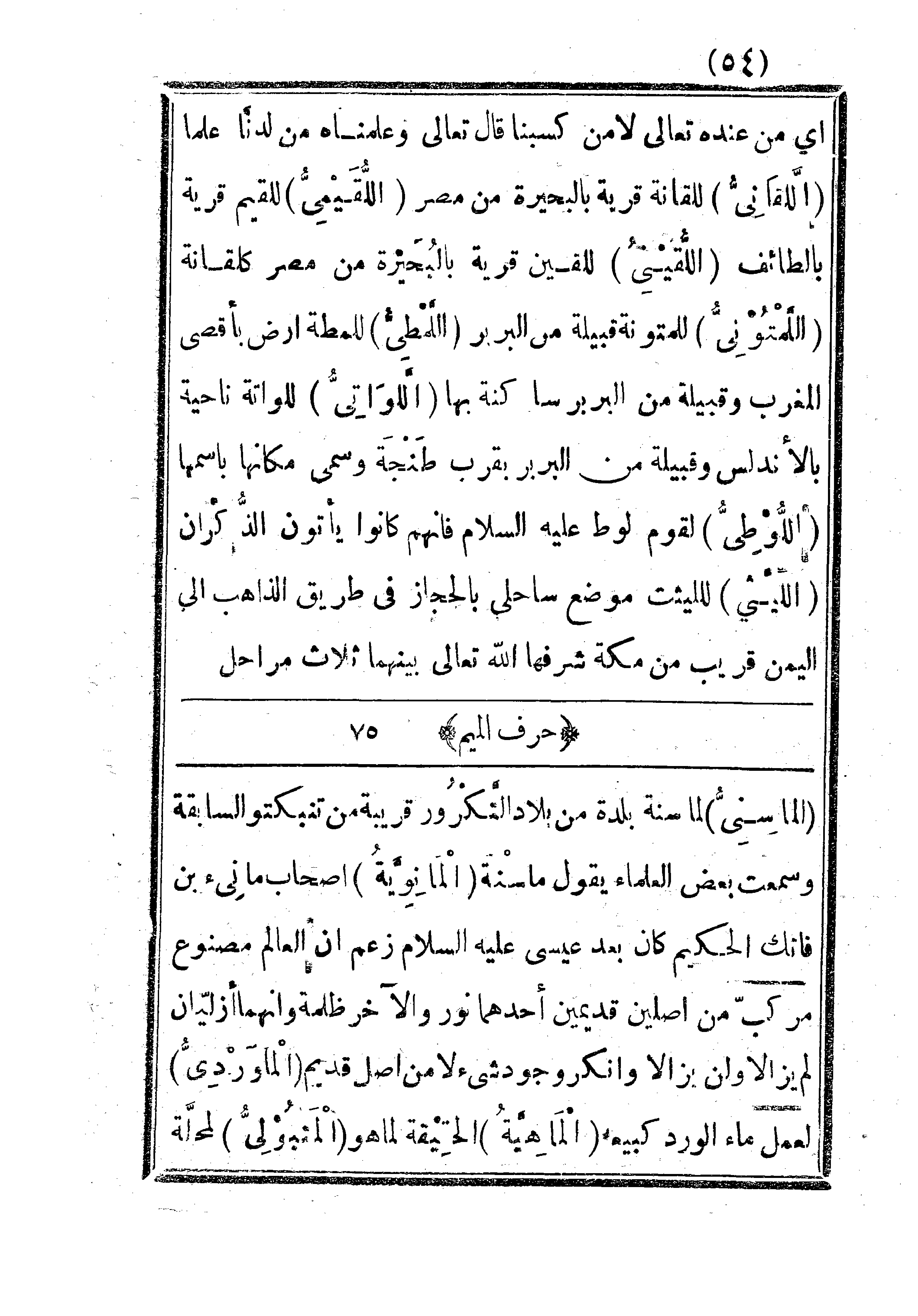 الماسني: لماسنة بلدة من بلاد التكرور قريبة من تنبكتو السابقة وسمعت بعض العلماء يقول ماسنة. المانوية: أصحاب مانىء بن فاتك الحكيم كان بعد عيسى عليه السلام زعم أن لعالم مصنوع مركب من أصلين قديمين أحدهما نور والآخر ظلمة وأنهما أزليان لم يزالا ولن يزالا وأنكر وجود شيء لا من أصل قديم. الماوردي: لعمل ماء الورد كبيعه. الماهية: الحقيقة لما هو. المتبولي: لمحلة