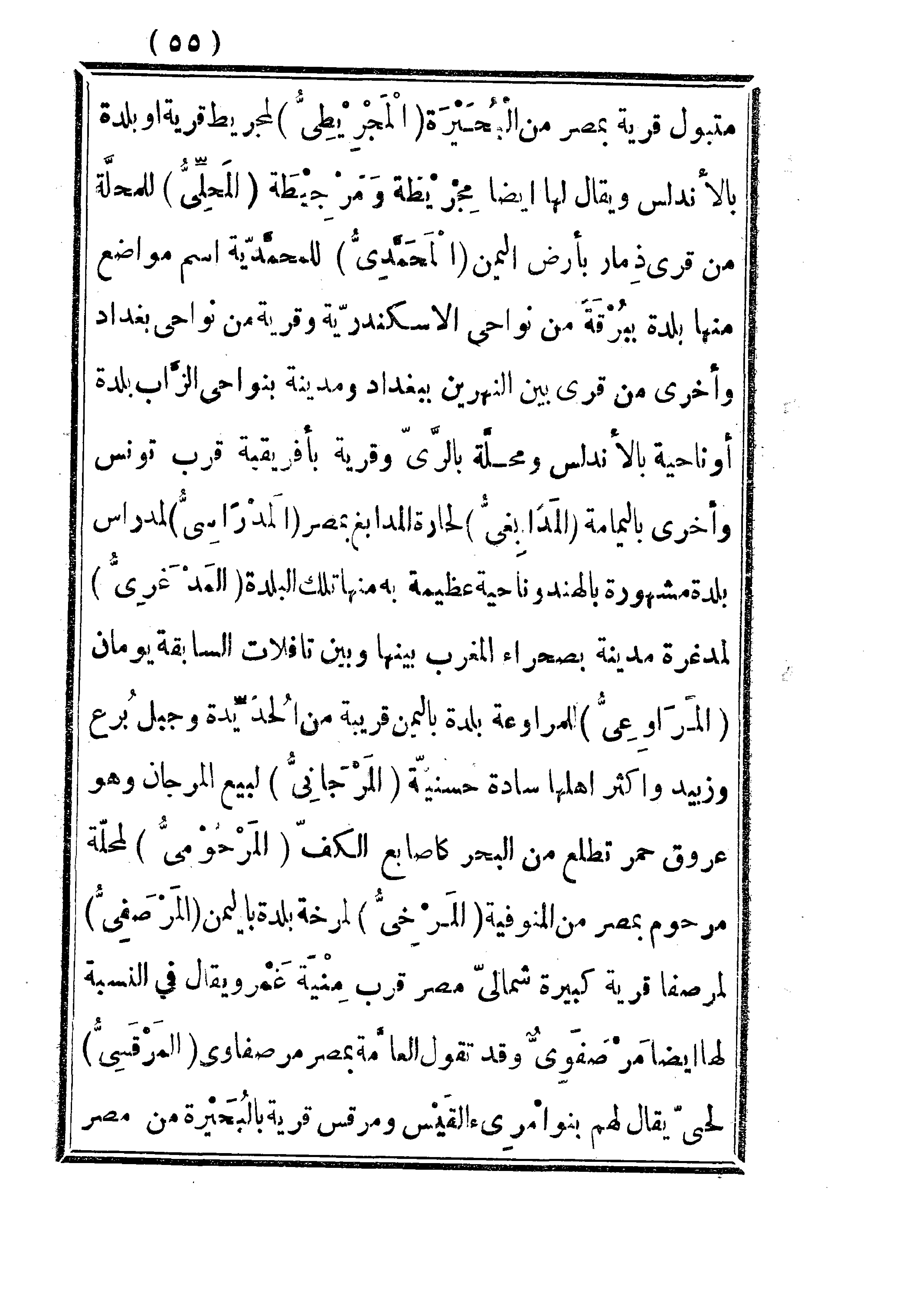 متبول قرية بمصر من البحيرة. المجريطي: لمجريط قرية أو بلدة بالأندلس ويقال لها أيضاً مجريطة ومرجيطة. المحلي: للمحلة من قرى ذمار بأرض اليمن. المحمدي: للمحمدية اسم مواضع منها بلدة ببرقة من نواحي الإسكندرية وقرية من نواحي بغداد وأخرى من قرى بين النهرين ببغداد ومدينة بنواحي الزاب بلدة أو ناحية بالأندلس ومحلة بالري وقرية بإفريقية قرب تونس وأخرى باليمامة. المدابغي: لحارة المدابغ بمصر. المدارس: لمدراس بلدة مشهورة بالهند وناحية عظيمة به منها تلك البلدة. المدغري: لمدغرة مدينة بصحراء المغرب بينها وبين تافلات السابقة يومان. المرواعي: للمراوعة بلدة باليمن قريبة من الحديدة وجبل برع وزبيد وأكثر أهلها سادة حسنية. المرجاني: لبيع المرجان وهو عروق حمر تطلع من البحر كأصابع الكف. المرجومي: لمحلة مرحوم بمصر من المنوفية. المرخي: لمرخة بلدة باليمن. المرصفي: لمرصفا قرية كبيرة شمالي مصر قرب منية غمر ويقال في النسبة لها أيضاً مرصفوي وقد تقول العامة بمصر مرصفاوي. المرقسي: لحي يقال لهم بنوا امرىء القيس وموقس قرية بالبحيرة من مصر