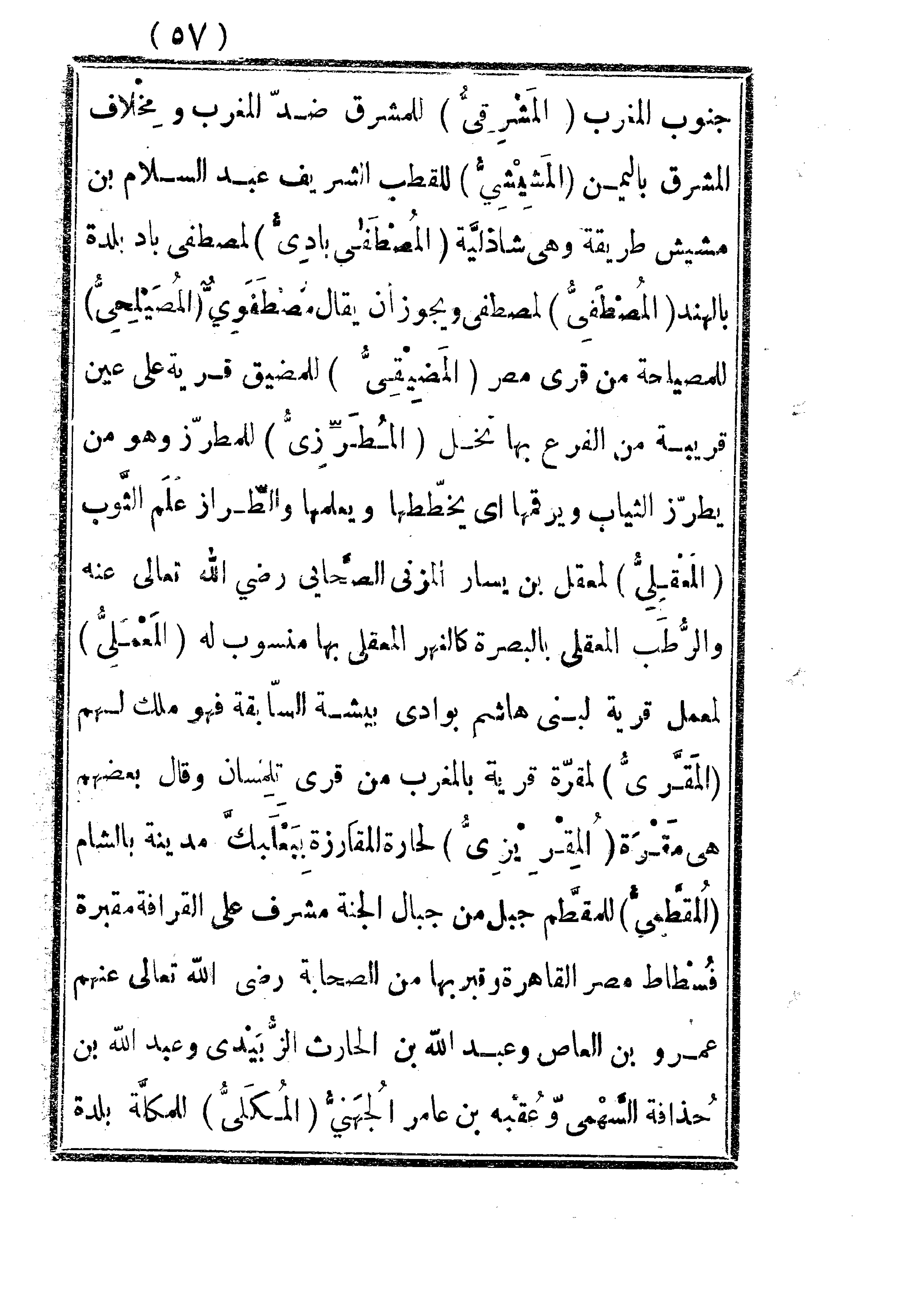 المصطفى: ويجوز أن يقال مصطفوي. المصيلحي: للمصيلحة من قرى مصر. المضيفي: للمضيق قرية على عين قريبة من الفرع بها نخل. المطرزي: للمطرز وهو من يطرز الثياب ويرقمها أي يخططها ويعلمها والطراز علم الثوب. المعقلي: لمعقل بن يسار المزني الصحابي رضي الله تعالى عنه والرطب المعقلي بالبصرة كالنهر المعقلي بها منسوب له. المعملي: لمعمل قرية لبني هاشم بوادي بيشة السابقة فهو ملك لهم. المقري: لمقرة قرية بالمغرب من قرى تلمسان وقال بعضهم هي مقرة. المقريزي: لحارة المقارزة ببعلبك مدينة بالشام. المقطمي: للمقطم جبل من جبال الجنة مشرف على القرافة مقبرة فسطاط مصر القاهرة وقبر بها من الصحابة رضي الله تعالى عنهم عمرو بن عبد العزيز وعبد الله بن الحارث الزبيدي وعبد الله بن حذافة السهمي وعقبة بن عامر الجهني. المكلي: للمكلة بلدة
