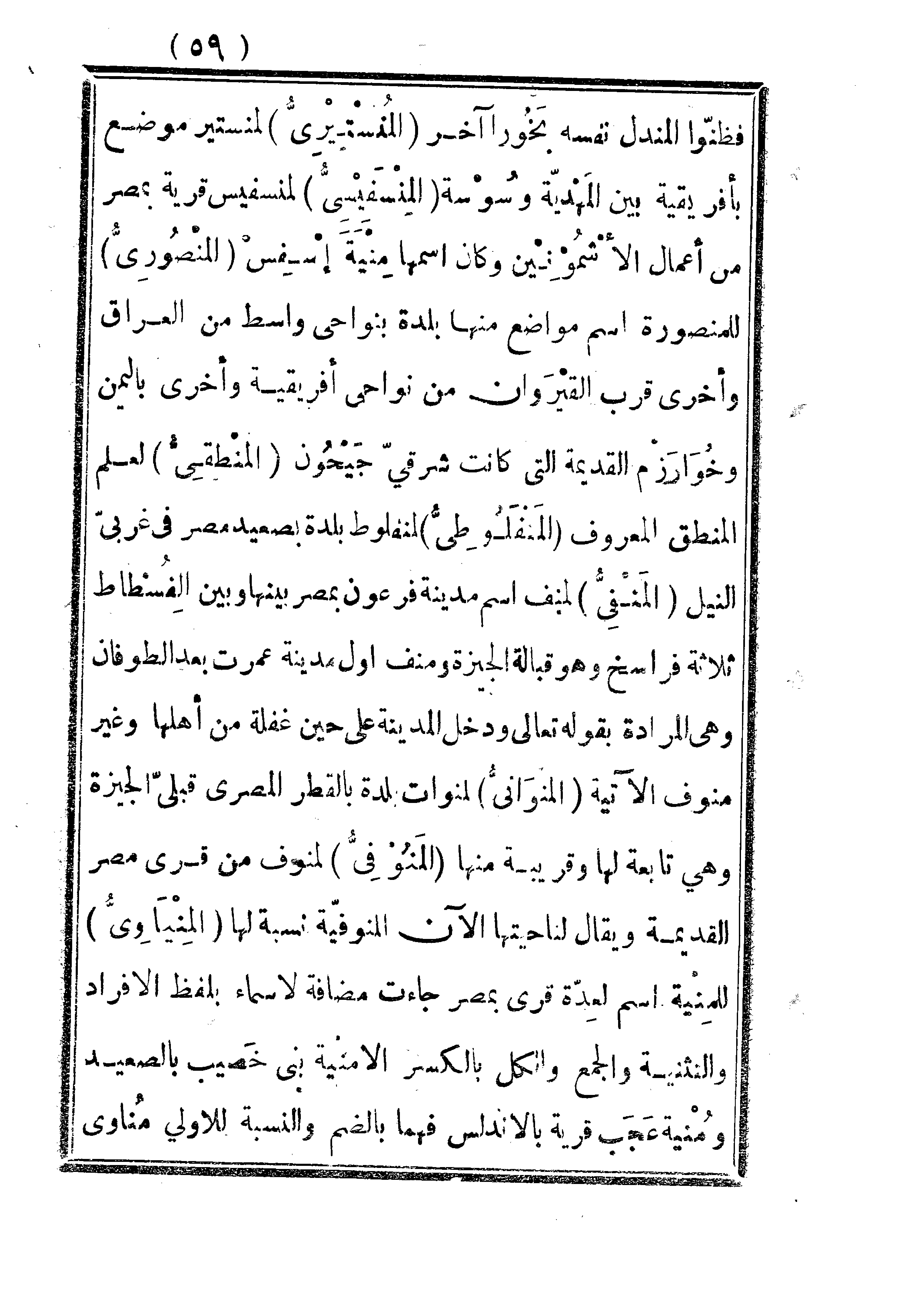 فظنوا المندل نفسه بخوراً آخر. المنستيري: لمنستير موضع بإفريقية بين المهدية وسوسة. المنسفيسي: لمنسفيس قرية بمصر من أعمال الأشمونين وكان اسمها منية إسفس. المنصوري: للمنصورة اسم مواضع منها بلدة بنواحي واسط من العراق وأخرى قرب القيروان من نواحي إفريقية وأخرى باليمن وخوارزم القديمة التي كانت شرقي جيحون. المنطقي: لعلم المنطق المعروف. المنفلوطي: لمنفلوط بلدة بصعيد مصر في غربي النيل. المنفي: لمنف اسم مدينة فرعون بمصر بينها وبين الفسطاط ثلاثة فراسخ وهو قبالة الجيزة ومنف أول مدينة عمرت بعد الطوفان وهي المرادة بقوله تعالى ودخل المدينة على حين غفلة من أهلها وغير منوف الأتية. المنواني: لمنوات بلدة بالقطر المصري قبلي الجيزة وهي تابعة لها وقريبة منها. المنوفي: لمنوف من قرى مصر القديمة ويقال لناحيتها الآن المنوفية نسبة لها. المنياوي: للمنية اسم لعدة قرى بمصر جاءت مضافة لأسماء بلفظ الإفراد والتثنية والجمع والكل بالكسر إلا منية بني خصيب بالصعيد ومنية عجب قرية بالأندلس فهما بالضم والنسبة للأولى مناوي