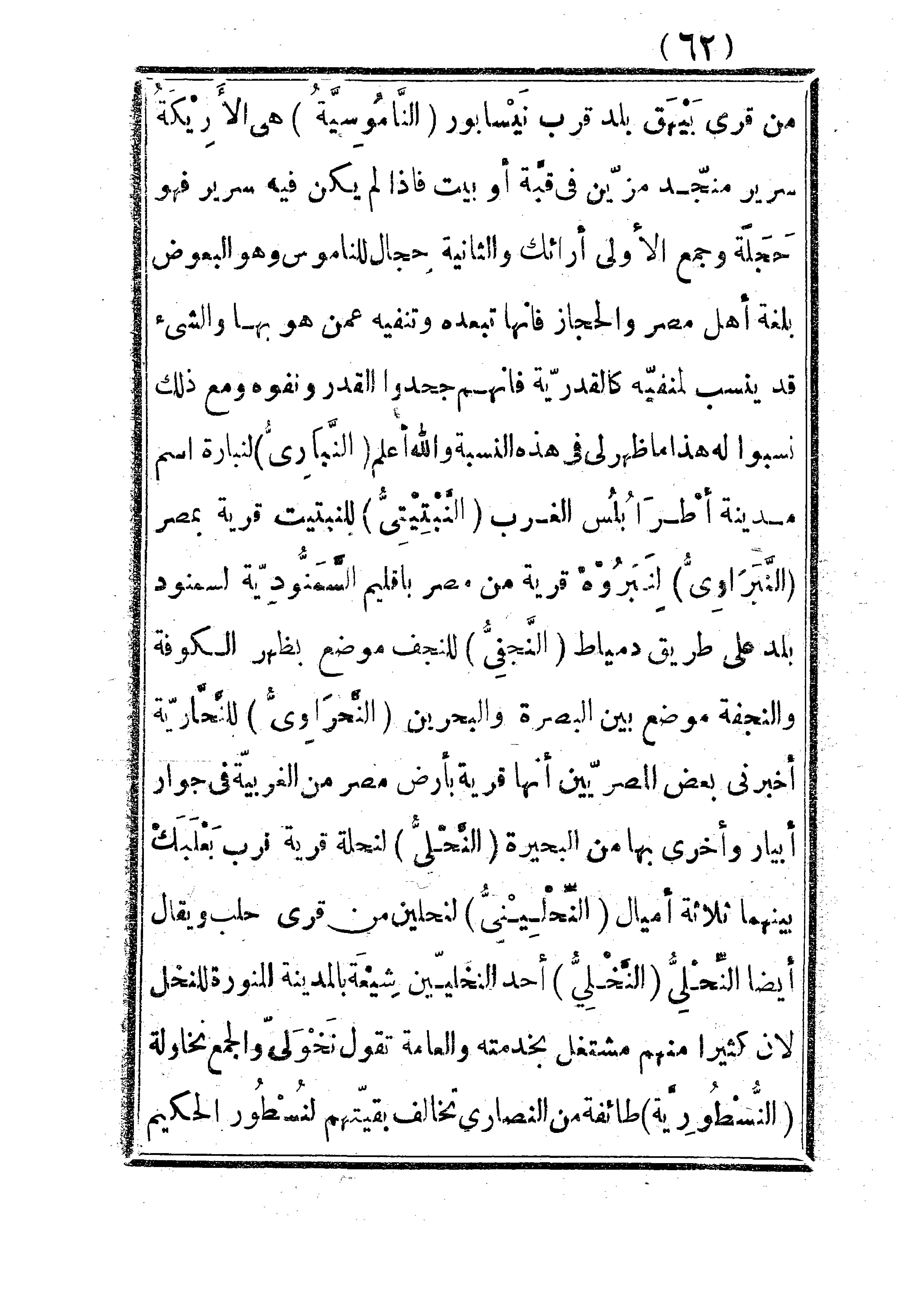 من قرى بيهق بلد قرب نيسابور. الناموسية: هي الأريكة سرير منجد مزين في قبة أو بيت فإذا لم يكن فيه سرير فهو حجلة وجمع الأولى أرائك والثاني حجال للناموس وهو البعوض بلغة أهل مصر والحجاز فإنها تبعده وتنفيه عمن هو بها والشيء قد ينسب لمنفيه كالقدرية فإنهم جحدوا القدر ونفوه ومع ذلك نسبوا له هذا ما ظهر لي في هذه النسبة والله أعلم. النباري: لنبارة اسم مدينة أطرابلس الغرب. النبتيتي: للنبتيت قرية بمصر. النبراوي: لنبروه قرية من مصر بإقليم السمنودية لسمنود بلد على طريق دمياط. النجفي: للنجف موضع بظهر الكوفة والنجفة موضع بظهر الكوفة والنجفة موضع بين البصرة والبحرين. النحراوي: للنحارية أخبرني بعض المصريين أنها قرية بأرض مصر من الغربية في جوار أبيار وأخرى بها من البحيرة. النحلي: لنحلة قرية قرب بعلبك بينهما ثلاثة أميال. النحليني: لنحلين من قرى حلب ويقال أيضاً النحلي. النخلي: أحد النخليين شيعة بالمدينة المنورة للنخل لأن كثيراً منهم مشتغل بخدمته والعامة تقول نخولي والجمع نخاولة. النسطورية: طائفة من النصارى تخالف بقيتهم لنسطور الحكيم