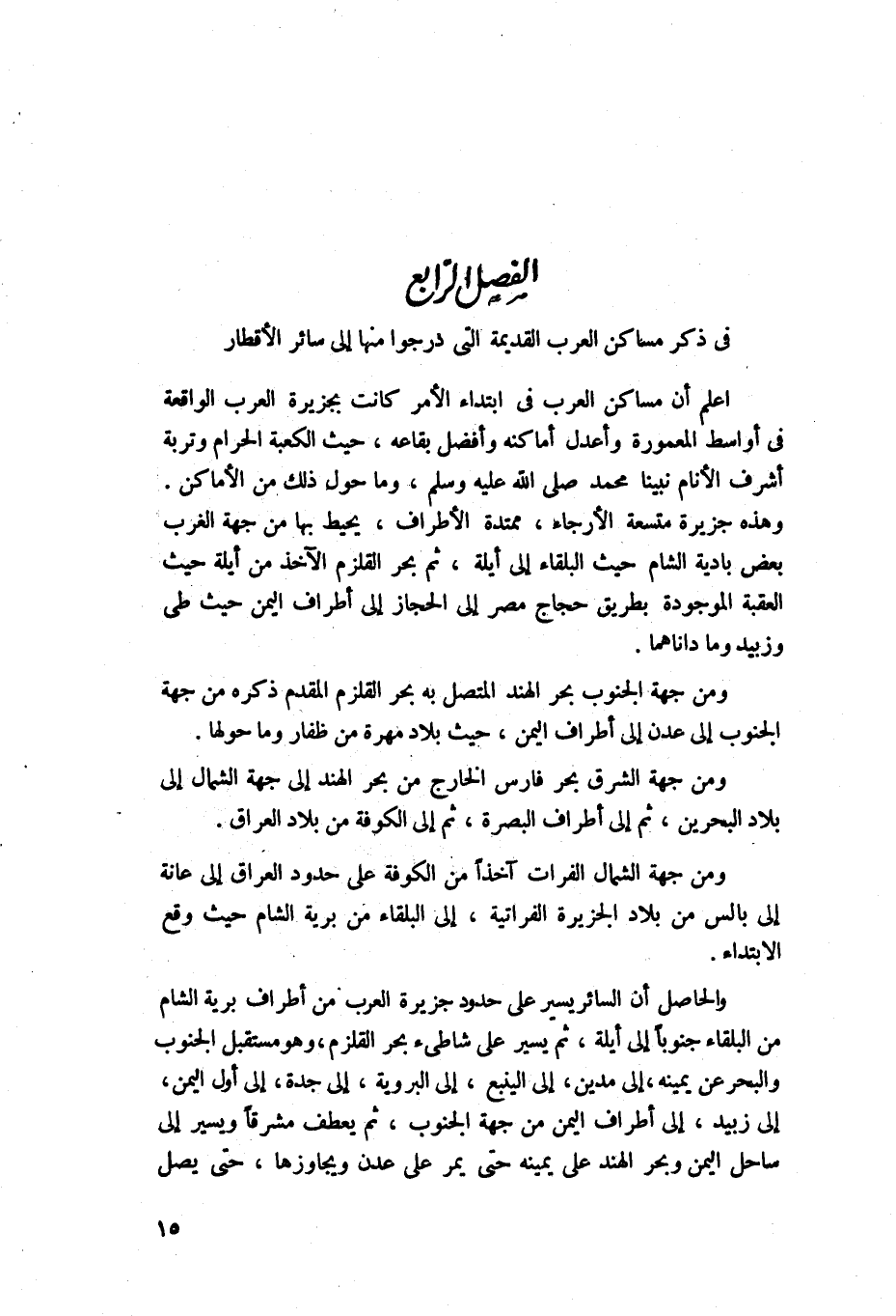 أعلم: أن مساكن العرب في ابتداء الأمر كانت بجزيرة العرب الواقعة في أواسط المعمور، واعدل أماكنه وأفضل بقاعه حيث الكعبة الحرام وتربة أشرف الانام نبينا محمد صلى الله عليه وسلم وما حول ذلك من الأماكن، وهذه الجزيرة متسعة الأرجاء، ممتدة الأطراف، يحيط بها من جهة الغرب بعض بادية الشام حيث البلقا إلى أيلة، ثم القلزم الآخذ من أيلة، حيث العقبة الموجودة بطريق حجاج مصر إلى الحجاز إلى أطراف اليمن حيث طي وزبيد وما داناهما، ومن جهة الجنوب بحر الهند المتصل به بحر القلزم المقدم ذكره من جهة الجنوب إلى عدن إلى أطراف اليمن حيث بلاد مهرة من ظفار وما حولها، ومن جهة الشرق بحر فارس الخارج من بحر الهند إلى جهة الشمال إلى بلاد البحرين ثم إلى أطراف البصرة ثم إلى الكوفة من بلاد العراق، ومن جهة الشمال الفرات آخذاً من الكوفة على حدود العراق إلى عانة إلى بالس بلاد الجزيرة الفراتية إلى البلقا من برية الشام حيث وقع الابتداء.