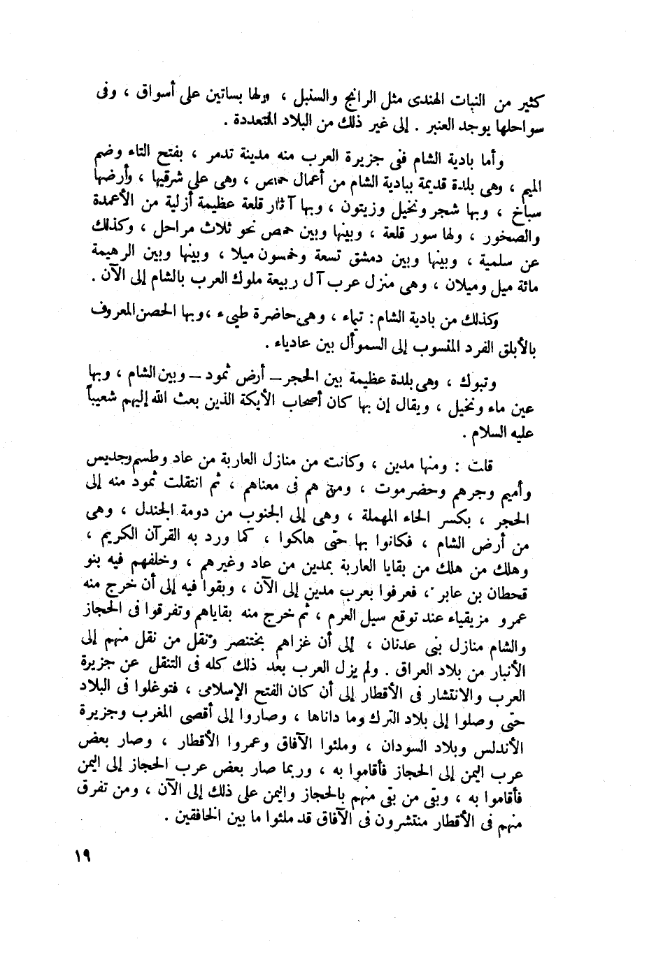 قلت ومنها مدين: وكانت بها منازل العرب العاربة من عاد وطسم وجديس وأميم وجرهم وحضرموت ومن هم في معناهم، ثم انتقلت ثمود منها إلى الحجر بكسر الحاء المهملة وهي إلى الجنوب من دومة الجندل وهي من أرض الشام فكانوا بها حتى هلكوا كما ورد به القرآن الكريم. وهلك من هلك من بقايا العرب العاربة باليمن بمدين من عاد وغيرهم، وخلفهم فيه بنو قحطان بن عابر فعرفوا بعرب مدين إلى الآن وبقوا فيه إلى أن خرج منه عمرو بن مزيقياء عند توقع سيل العرم ثم خرج منه بقاياهم وتفرقوا في الحجاز والعراق والشام وغيرها عند حدوث سيل العرم، وكانت أرض الحجاز منازل لني عدنان إلى أن غزاهم بخت نصر ونقل من نقل منهم إلى الانبار من بلاد العراق، ولم يزل العرب بعد ذلك كلهم في التنقل عن جزيرة العرب والانتشار في الأقطار إلى أن كان الفتح الاسلامي فتوغلوا في البلاد حتى وصلوا إلى بلاد الترك وما داناها وصاروا إلى أقصى المغرب وجزيرة الاندلس وبلاد السودان وملأوا الآفاق، وعمروا الأقطار، وصار بعض عرب اليمن إلى الحجاز فأقاموا به وربما صار بعض عرب الحجاز إلى اليمن فأقاموا به وبقي من بقي منهم بالحجاز واليمن على ذلك إلى الآن، ومن تفرق منهم في الاقطار منتشرون في الآفاق قد ملأوا ما بين الخافقين.