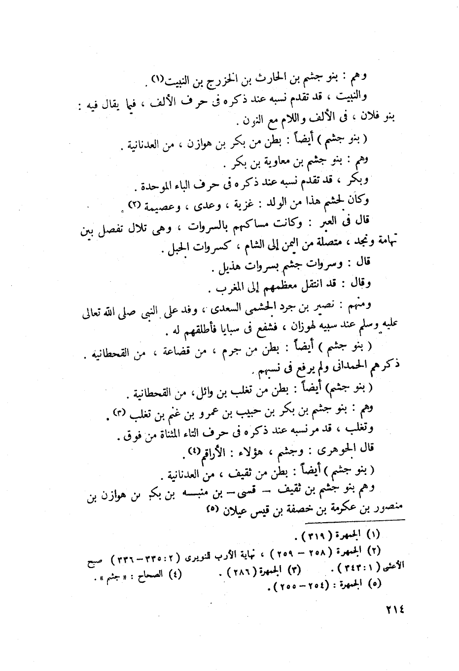 709 - بنو جشم - أيضاً - بطن من بكر من هوزان من العدنانية، وهم بنو جشم بن معاوية بن بكر، وبكر قد تقدم نسبه عند ذكره في حرف الباء ابلموحدة، وكان لجشم هذا من الولد غزية، وعدي وعصمة. قال في العبر: وكانت مساكنهم بالسروات وهي بلاد تفصل بين تهامة ونجد متصلة من اليمن إلى الشام كسروات الجبل، وسروات جشم متصلة بسروات هذيل. قال: وقد انتقل معطمهم إلى المغرب وهم الأزية ولم يبق بالسروات منهم إلا من ليس له صولة، ومنهم عثمان بن عبد الله بن ربيعة بن حبيب بن الحارث بن حبيب بن الحارث بن مالك بن خطيط بن جشم.