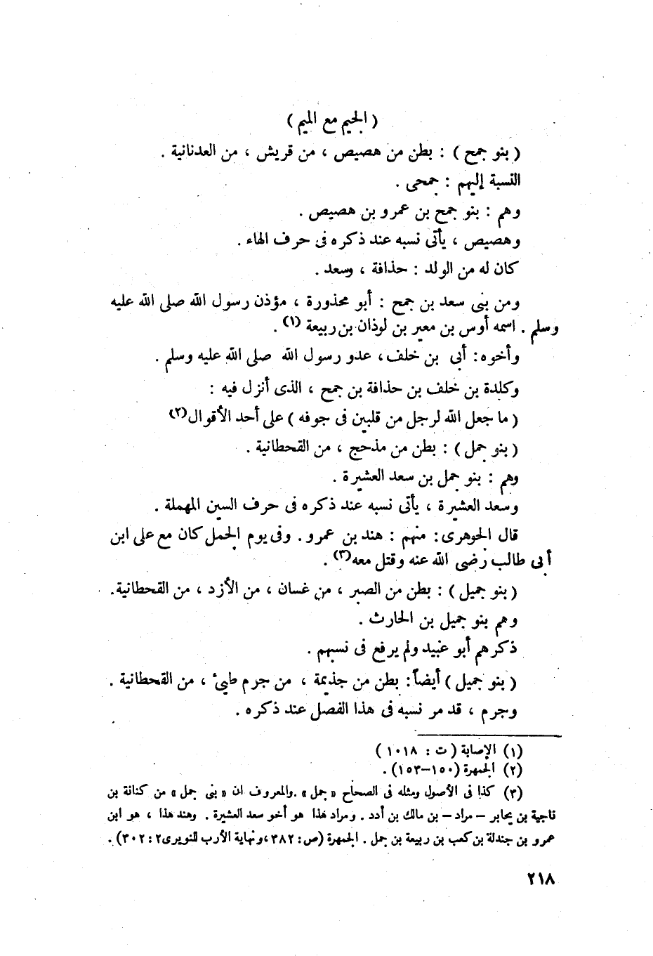 725 - بنو جمح - بطن من بني هصيص من قريش من العدنانية، النسبة إليهم جمحي، وهم بنو جمح بن هصيص، وهصيص يأتي نسبه عند ذكره في حرف الهاء، كان له من الولد حذافة، وسعد، ومن بني سعد بن جمح أبو محدورة مؤذن رسول الله صلى الله عليه وسلم اسمه اوس بن مغير بن لواذن بن ربيعة، وأخوه أنيس بن مغير قتل يوم بدر كافراً، ومن بني حذافة أمية بن خلف، واخوه أبي ابن خلف عدو رسول الله صلى الله عليه وسلم، وكلدة بن اسيد بن خلف بن حذافة بن جمح، الذي انزل فيه لقد خلقنا الإنسان في كبد وجميل بن معمر بن حبيب ابن وهب الذي انزل فيه ما جعل الله لرجل من قلبين في جوفه على أحد الأقوال.