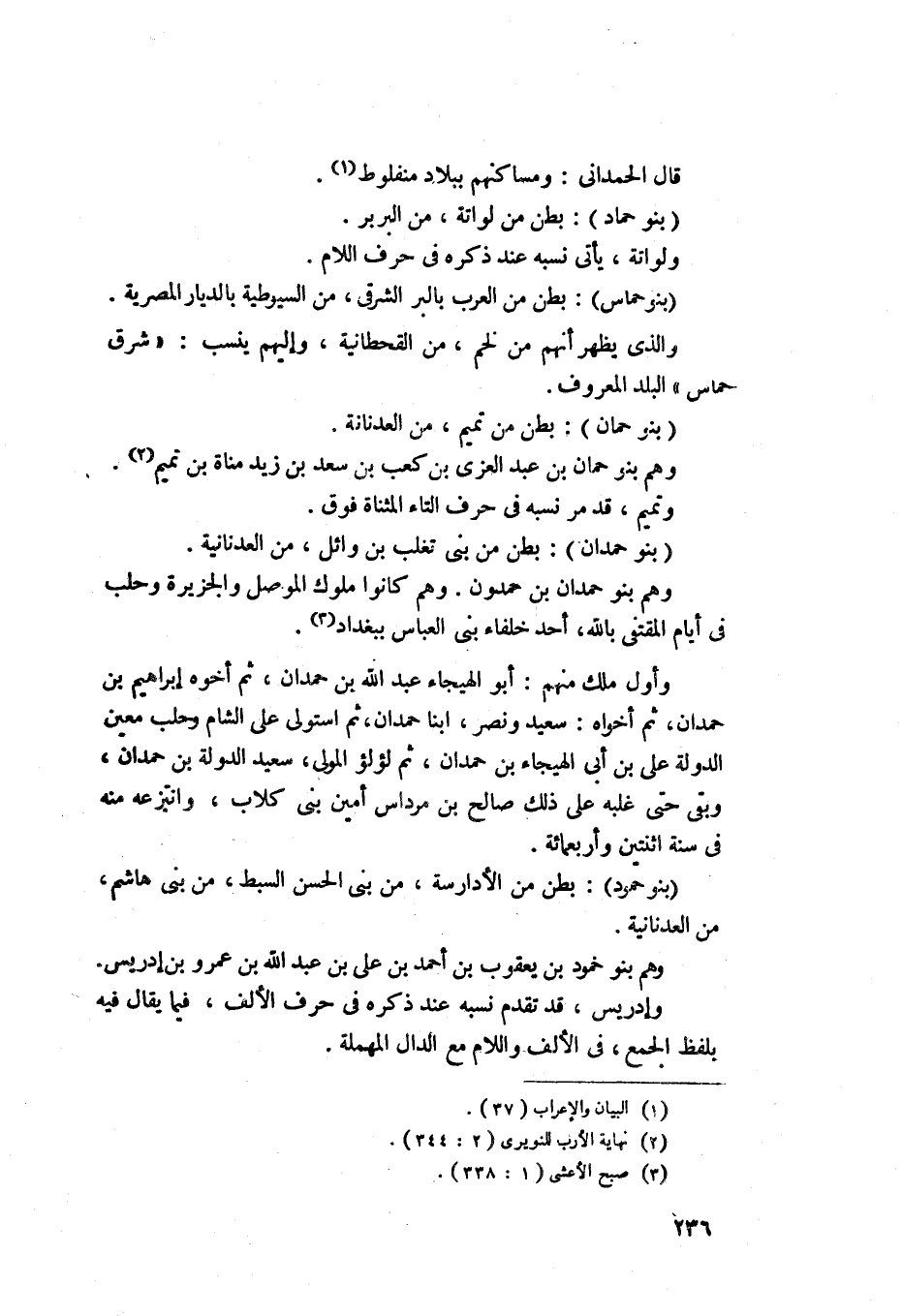 810 - بنو حمدان - بطن من بني ثعلب بن وائل من العدنانية، وهم بنو حمدان بن حمدون، وهم كانوا ملوك الموصل والجزيرة وحلب في أيام المتقي بالله أحد خلفاء بني العباس ببغداد، وأول من ملك منهم أبو الهيجاء عبد الله بن حمدان، ثم أخوه إبراهيم بن حمدان، ثم أخوه سعيد ونصر أبناء حمدان، ثم استولى على الشام وحلب سيف الدولة علي بن أبي الهيجاء بن حمدان، ثم لؤلؤ المولى سعد الدولة بن حمدان، وبقي حتى غلبه على ذلك صالح بن مرداس أمير بني كلاب وانتزعه منه في سنة اثنتين وأربعمائة.