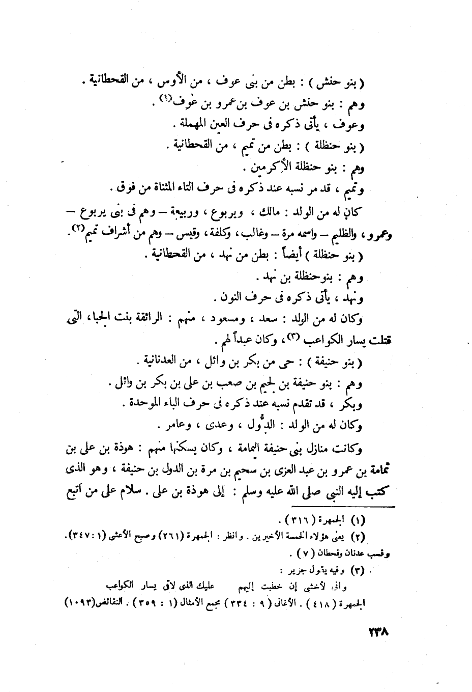 819 - بنو حنيفة - حي من بكر بن وائل منالعدنانية، وهمبنو حنيفة ابن لحيم بن صعب بنعلي بن بكر بن وائل، وبكر قد تقدم نسبه عند ذكره في حرف الباء الموحدة، وكان له من الولد الرول، وعدي، وعامر، وكانت منازل بني حنيفة اليمامة، وكان يسكنها منهم هودة بن علي بن ثمامة بن عمرو بن عبد العزي بن لحيم بن مرة بن الدوك بن حنيفة، وهو الذي كتب إليه النبي صلى الله عليه وسلم يدعوه إلى الإسلام ونصه بعد البسملة: من محمد رسول الله إلى هودة بن علي: سلام على من اتبع