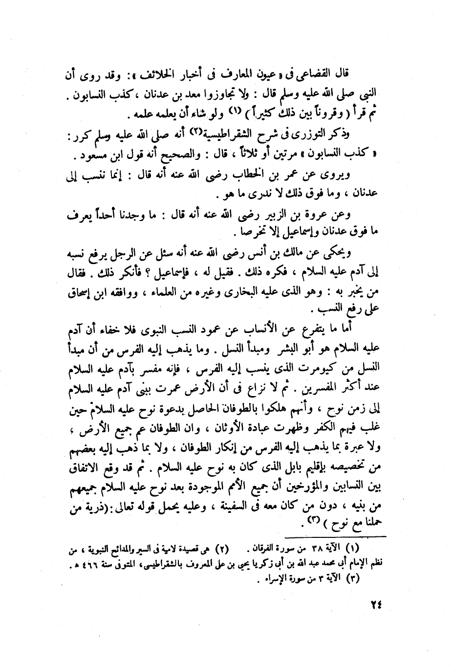 قال القضاعي في عيون المعارف في أخبار الخلائف: وقد روى أن النبي صلى الله عليه وسلم قال لا تجاوزوا معد بن عدنان كذب النسابون ثم قرأ: " وقروناً بين ذلك كثيراً " ولو شاء أن يعلمه علمه، وذكر التوزي في شرح الشقراطيسة: أنه صلى الله عليه وسلم كرر: كذب النسابون مرتين أو ثلاثاً، قال: والصحيح أنه قول ابن مسعود. ويروى عن عمر بن الخطاب رضي الله عنه أنه قال: إنما ننسب إلى عدنان وما فوق ذلك لا ندري ما هو، وعن عروة بن الزبير رضي الله عنه أنه قال: ما وجدنا أحداً يعرف ما فوق عدنان واسماعيل الا تخرصا، ويحكى عن مالك بن أنس رضي الله عنه أنه سئل عن الرجل برفع نسبه إلى آدم عليه السلام فكره ذلك. فقيل له فالى اسماعيل: فأنكر ذلك. وقال: ومن يخبر به؟! والذي عليه البخاري وغيره من العلماء، موافقه ابن اسحاق على رفع النسب.