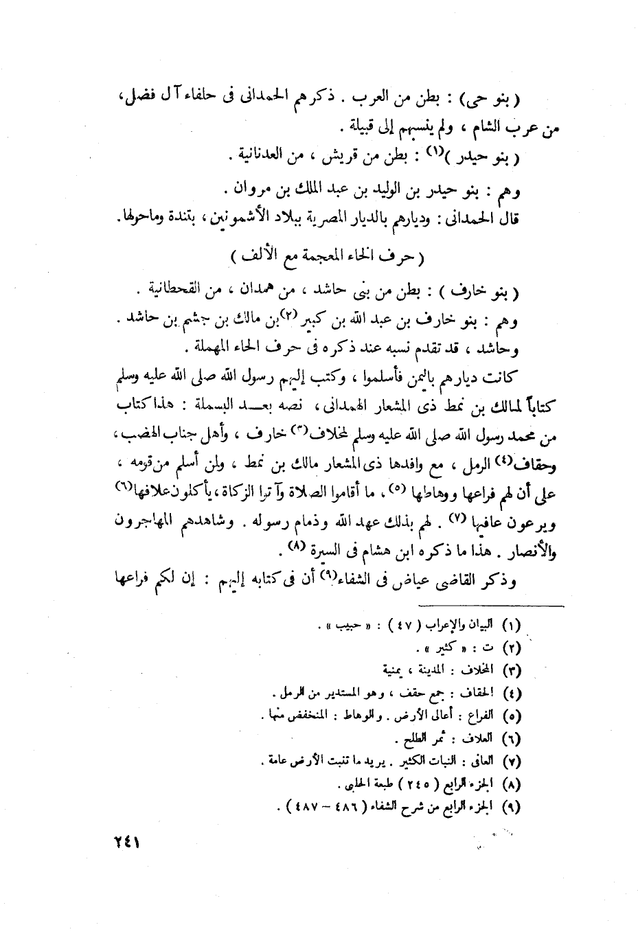 828 - بنو خارف - بطن من بني حاشد من همدان من القحطانية، وهم بنو خارف بن عبد الله بن كبير بن مالك بن جشم بن حاشد، وحاشد قد تقدم نسبه عند ذكره في حرف الحاء المهملة، كانت ديارهم باليمن فأسلموا وكتب إليهم رسول الله صلى الله عليه وسلم كتاباً لمالك بن نمط مع ذي الشعار الهمداني ما نصه بعد البسملة: هذا كتاب من محمد رسول الله لمحلات خارف وأهل جناب العصب وحقاف الرمل مع وافدها ذي الشعار، لمالك بن نمط ولمن أسلم من قومه، على أن لهم فراعها ووهاطها ما أقاموا الصلاة وأتوا الزكاة ياكلون علافها، ويرعون عافها، لهم بذلك عهد الله وذمام رسوله، وشاهدهم المهاجرون والأنصار، هذا ما ذكره ابن هشام في السيرة، وذكر القاضي عياض في الشفاء: أن في كتابه إليهم: أن لكم فراعها