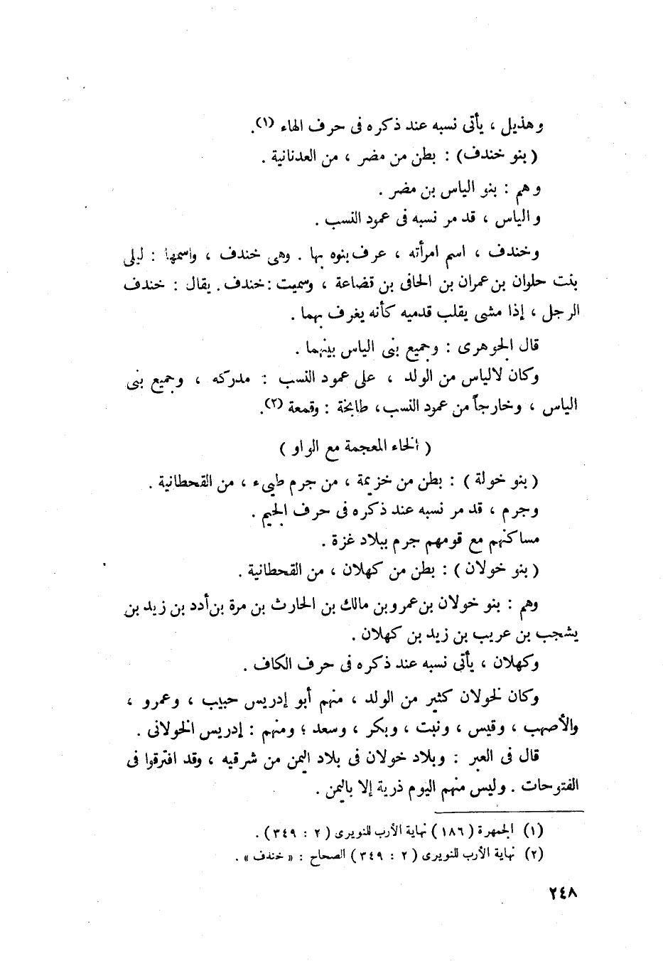 852 - بنو خولان - بطن من كهلان من القحطانية، وهم بنو خولان بن مالك بن الحارث بن مرة بن أدد بن زيد بن يشجب بن عريب بن زيد بن كهلان، وكهلان يأتي نسبه عند ذكره في حرف الكاف، وكان لخولان كثير من الولد، ومنهم أبو ادريس حبيب، وعمرو، والأصحب، وقيس، ونبت، وبكر، وسعد. ومنهم ادريس الخولاني. قال في العبر: وبلاد خولان في بلاد اليمن من شرقية، وقد افترقوا في الفتوحات، وليس منهم الحيوم وبرية إلا باليمن.