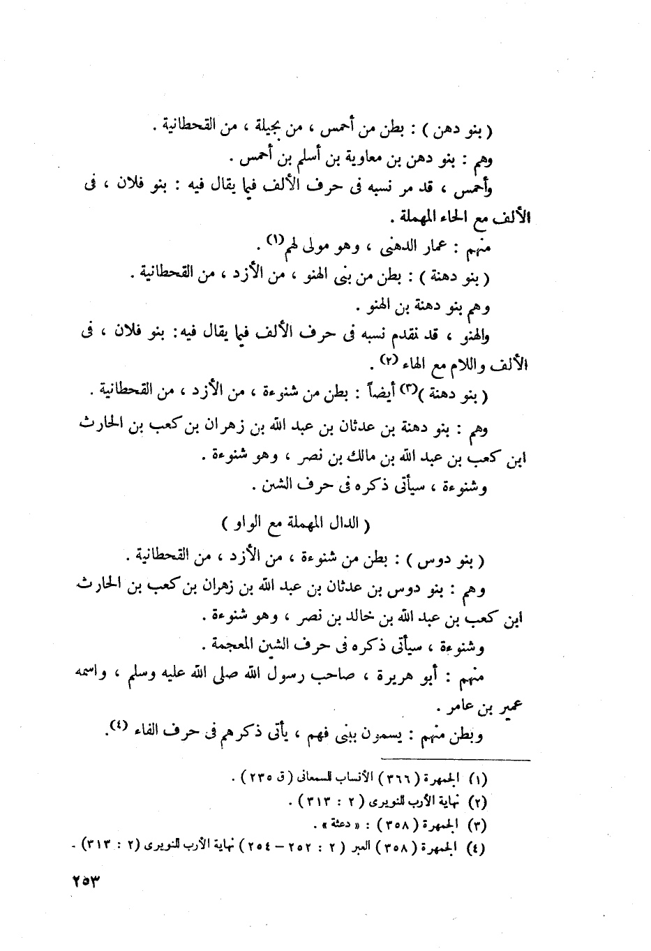 870 - بنو دوس - بطن من شنؤة من الأزد من القحطانية، وهم بنو دوس ابن عدنان بن عبد الله بن زهران بن كعب بن الحارث بن كعب بن عبد الله بن خالد بن نصر، وهو شنؤة وسيأتي نسبه عند ذكره في حرف الشين المعجمة، منهم أبو هريرة صاحب رسول الله صلى الله عليه وسلم واسمه عمير بن عامر، وبطن منهم يسمون ببني فهم، وفهم يأتي نسبه عند ذكره في حرف الفاء.