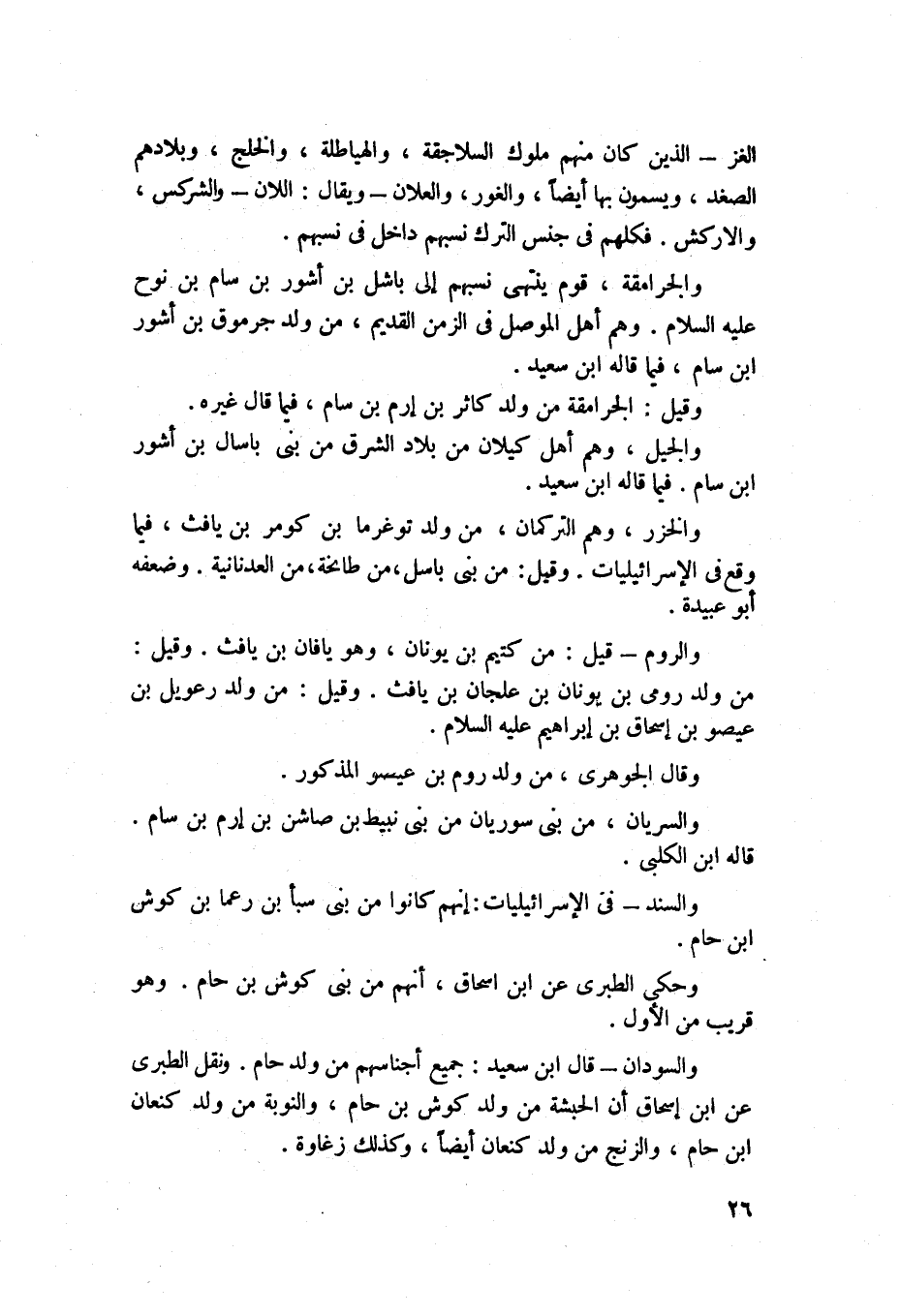 والسودان: قال ابن سعيد: جميع أجناسهم من ولد حام، ونقل الطبري عن ابن اسحاق أن الحبشة من ولد كوش بن حام، والنوبة من ولد كنعان بن حام، والزنج من ولد كنعان أيضاً، وكذلك زغاوة،