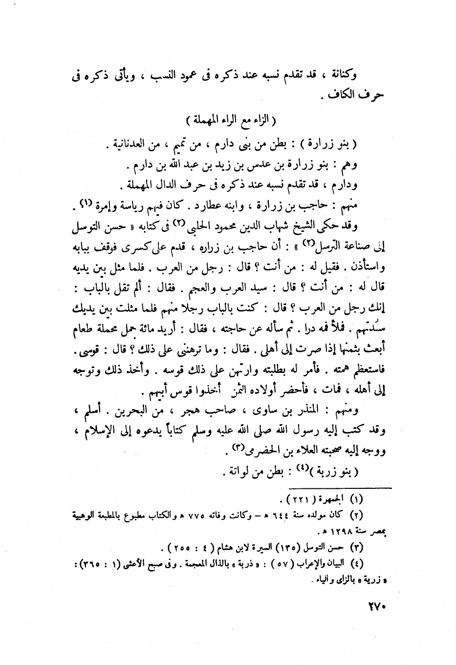 949 - بنو زرارة - بطن من بني دارم من تميم من العدناينة، وهم بنو زرارة بن عدس بن زبيد بن عبد الله بن دارم، ودارم قد تقدم نسبه عند ذكره في حرف الدال المهملة، منهم حاجب بن زرارة، وابنه عطارد، كان فيهم رياسة وأمرة، وقد حكى الشيخ شهاب الدين محمود الحلبي في كتابه حسن التوسل في صناعة الترسل: ان حاجب بن زرارة قدم على كسرى فوقف ببابه واستأذن فقيل له رسول الله صلى الله عليه وسلم قال: رجل من العرب فلما مثل بين يديه. قال لهرسول الله صلى الله عليه وسلم قال سيد العرب والعجم، فقال: ألم تقل بالباب انك رجل من العرب. قال: كنت بالباب رجلا منهم، فلما مثلت بين يديك سدتهم فملأ فمه دراً ثم سأله عن حاجته. فقال: اريد مائة جمل محملة طعام ابعث بثمنها اذا صرت الى أهلي، فقال: وما ترهنني على ذلك، فقال قوسى هذا فاستعظم همته وأمر له بطلبته فارتهن على ذلك قوسه وأخذ ذلك وتوجه الىأهله فمات فأحضر أولاده الثمان وأخذوا قوس أبيهم، ومنهم المنذر بن ساوي صاحب هجر من البحرين وأسلم، وقد كتب اليه رسول الله صلى الله عليه وسلم كتاباً يدعوه الى الاسلام ووجه اليه صحبته العء بن الحضرمي.
