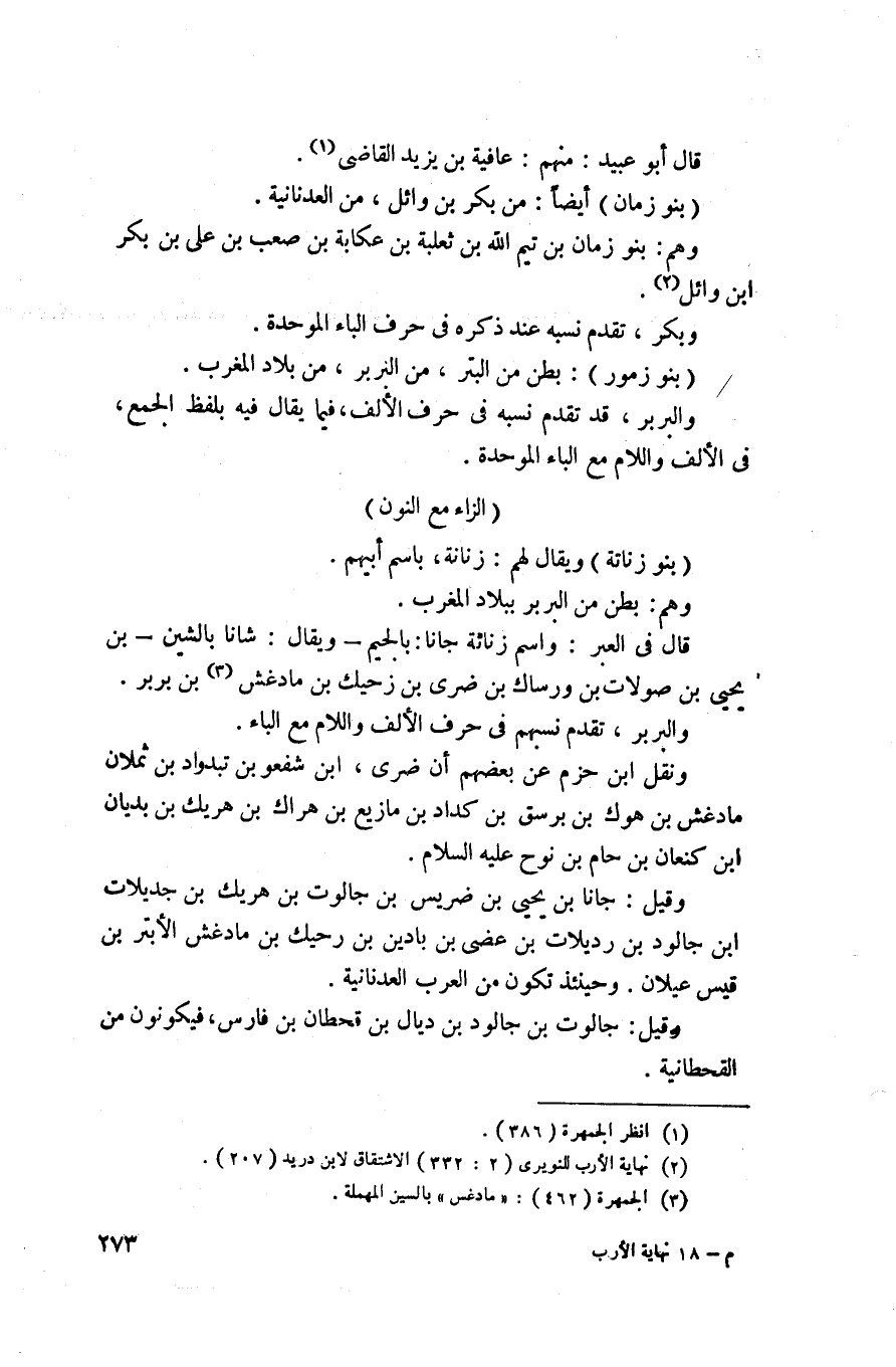 961 - بنو زناتة - ويقال لهم زناتة باسم ابيهم، وهم بطن من البتر من البربر ببلاد المغرب. قال في العبر: واسم زناتة جانا بالجيم، ويقال شانا بالشين ابن يحيى بن صولان بن ورساك بن صبري بن زحيل بن مادغش بن بربر، والبربر قد مر نسبهم في حرف الألف، ونقل ابن حزم عن بعضهم: ان صبري ابن شقفوا بن بندر بن أد بن تميلا بن مادغش بن هوك بن بحف بن كداد بن مازيع بن هراك بن هريك بن بدا بن بديان بن كنعان بن حام بن نوح عليه السلام، وقيل جانا بن يحيى بن ضريس بن جالون بن هربيك بن جديلات ابن جالود بن دريلات بن غضى بن يادين بن رحيل بن مادغش الابتر بن قيس غيلان، وقيل جالوت بن جالود بن ذيال بن قحطان بن فارس.