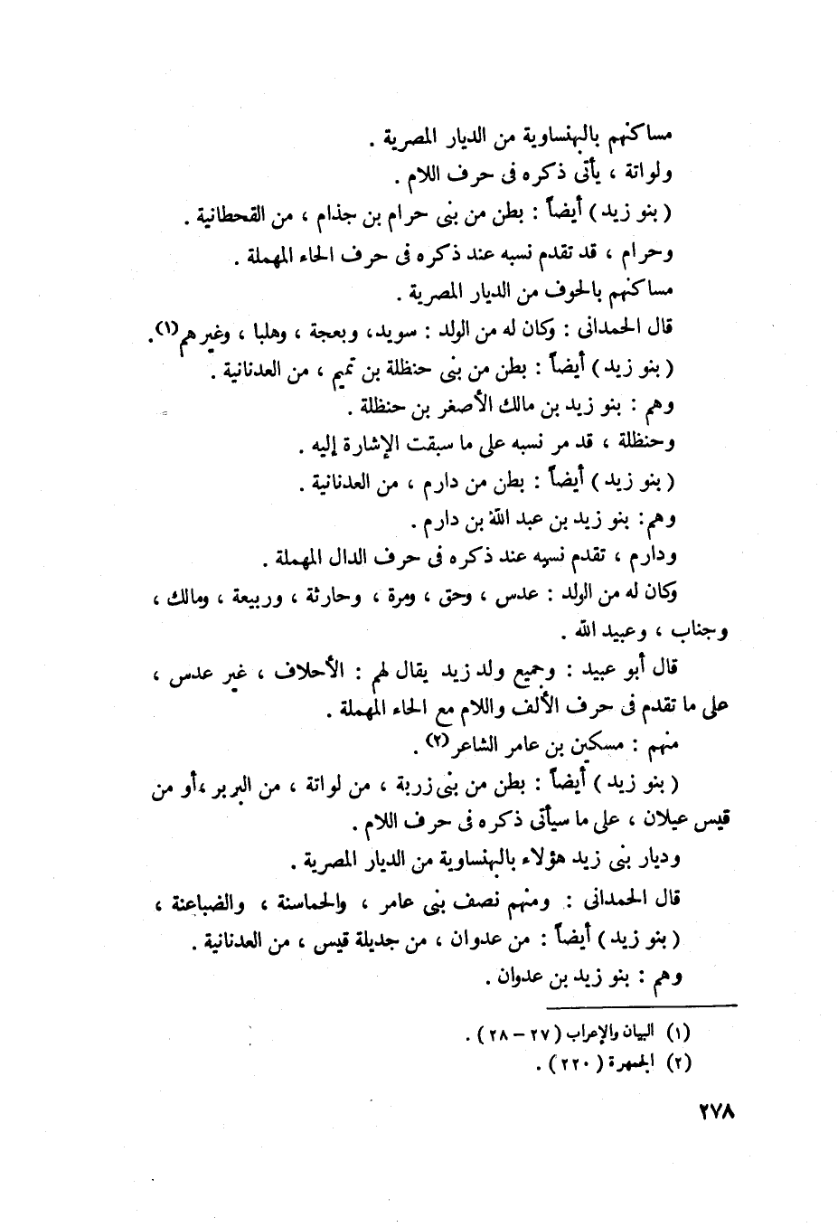 979 - بنو زيد - أيضاً - بطن من حرام بن جذام من القحطانية، وحرام قد تقدم ذكره في حرف الحاء المهملة، مساكنهم بالخوف من الشرقية من الديار المصرية. قال الحمداني: وكان له من الولد سويد، وبعجة، وهلبا ملك، وغيرهم.
