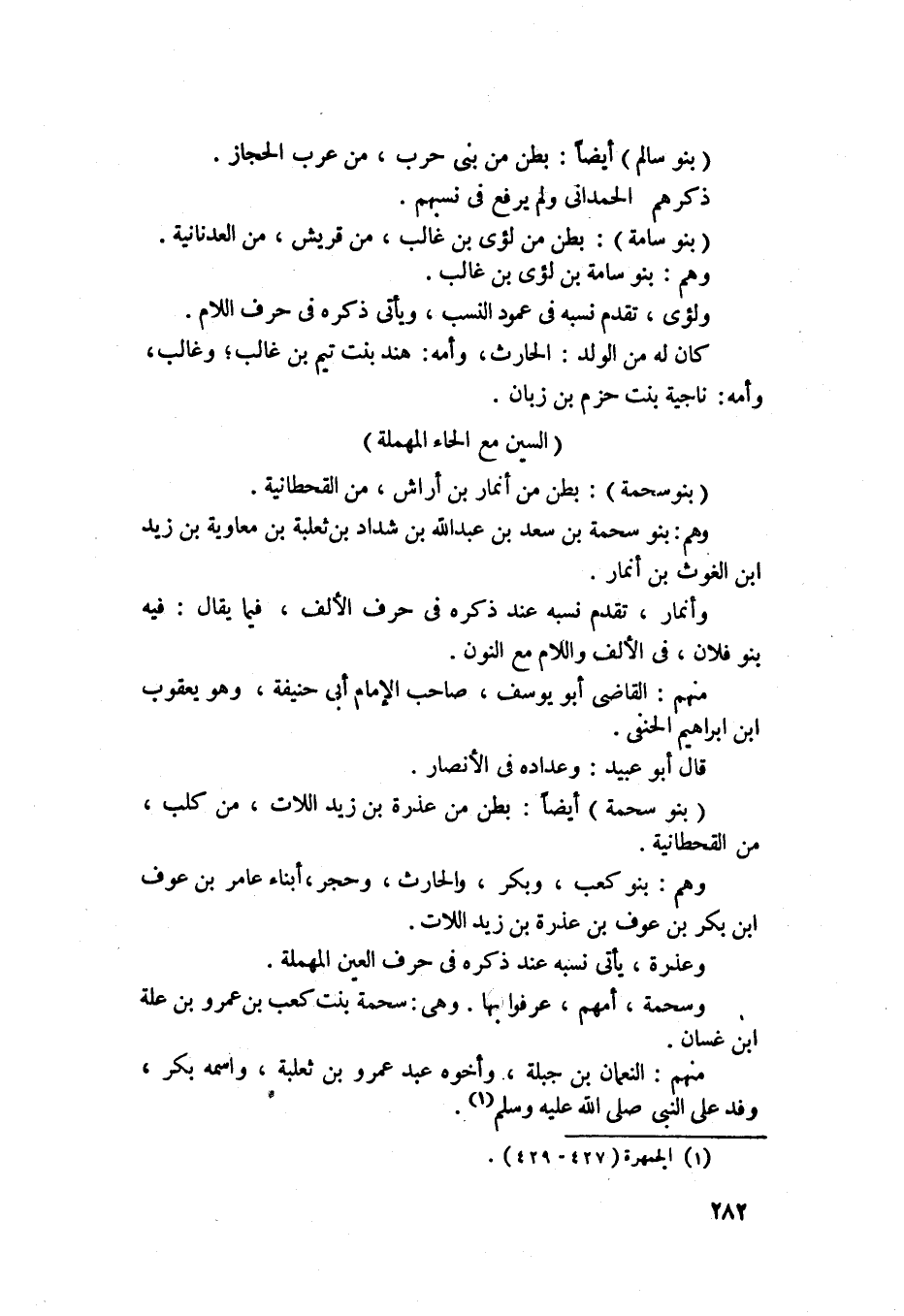 999 - بنو سحمة - بطن من انمار بن أراش من القحطانية، وهم بنو سحمة بن سعد بن عبد الله بن قداد بن ثعلبة بن معاوية بن زيد بن الغوث بن انمار، وانمار تقدم نسبه عند ذكره في حرف الألف فيما يقال فيه بنو فلان في الألف واللام مع النون، منهم القاضي أبو يوسف صاحب الأمام أبي حنيفة وهو يعقوب بن إبراهيم بن خنيس، قال أبو عبيد: وعداده في الأنصار.