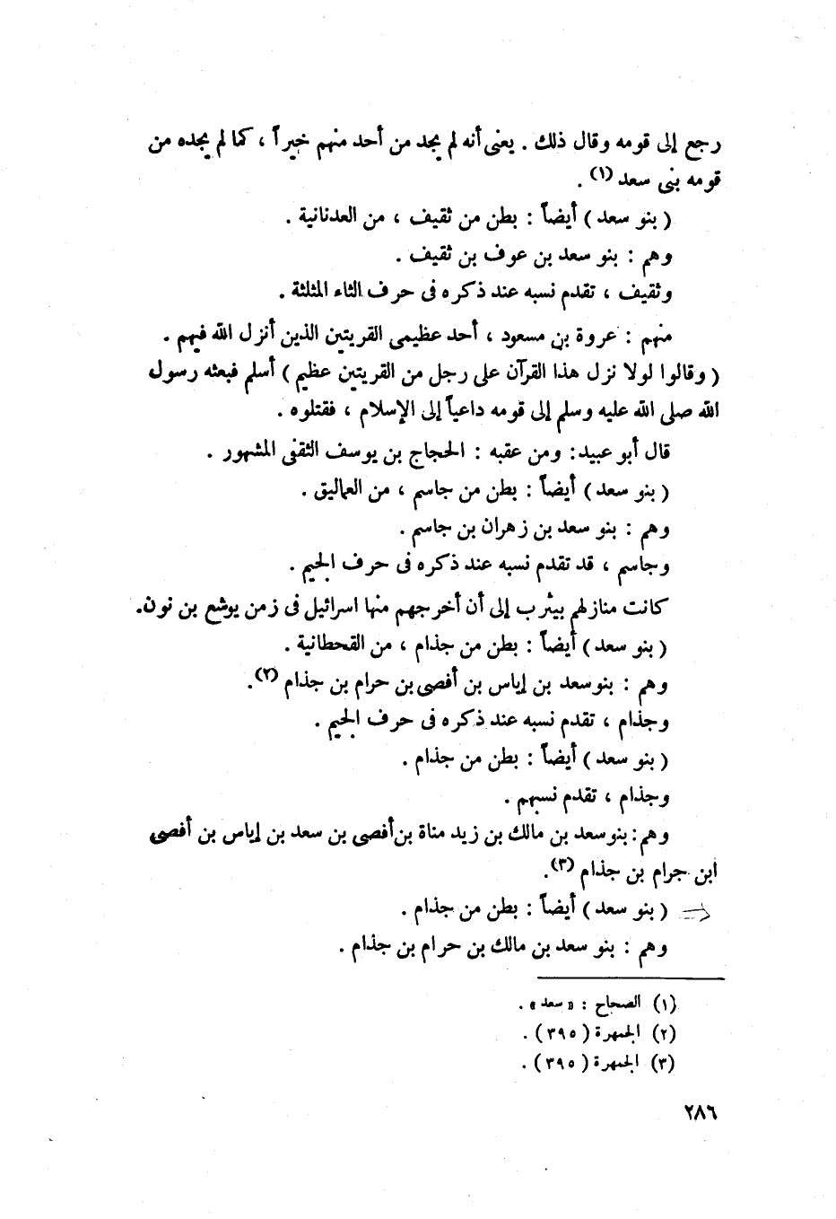 1015 - بنو سعد - أيضاً - بطن من ثقيف من العدنانية وهم بنو سعد ابن عوف بن ثقيف وثقيف تقدم نسبه عند ذكره في حرف الثاء المثلثة منهم عروة بن مسعود احد عظيمي القريتين الذين انزل فيهم وقالوا لولا نزل هذا القران على رجل من القريتين عظيماسلم فبعثه رسول الله صلى الله عليه وسلم الىقومه داعياالى الاسلام فقتلوه قال ابو عبيد: ومن عقبه الحجاج بن يوسف الثقفي المشهور 1016 - بنوسعد - ايضا - بطن من جاسم من العماليق وهم بنو سعد بن هزان بن جاسم قد تقدم نسبه عند ذكره في حرف الجيم كانت منازلهم بيثرب الىان اخرجهم منها بنو اسرائيل في زمن يوشع بن نون 1017 - بنو سعد - ايضا - بطن من جذام من القحطانية وهم بنو سعد إبن أياس بن حرام ابن جذام، وجذام تقدم نسبه عند ذكره في حرف الجيم.