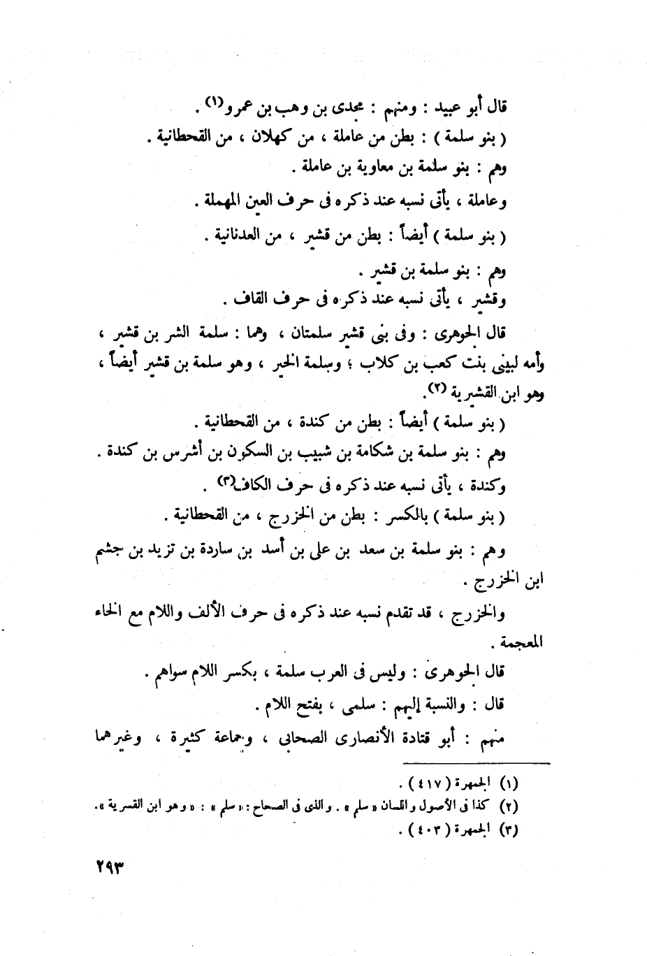 1045 - بنو سلمة - أيضاً - بطن من قشير من العدنانية، وهم بنو سلمة ابن قشير، وقشير يأتي نسبه عند ذكره في حرف القاف. قال الجوهري: وفي بني سلمى سلمتان، وهما سلمة الشر بن قشير، وأمه لبنى بنت كعب بن كلاب، وسلمة الخير وهو سلمة بن قشير أيضاً وأمه القشيرية.
