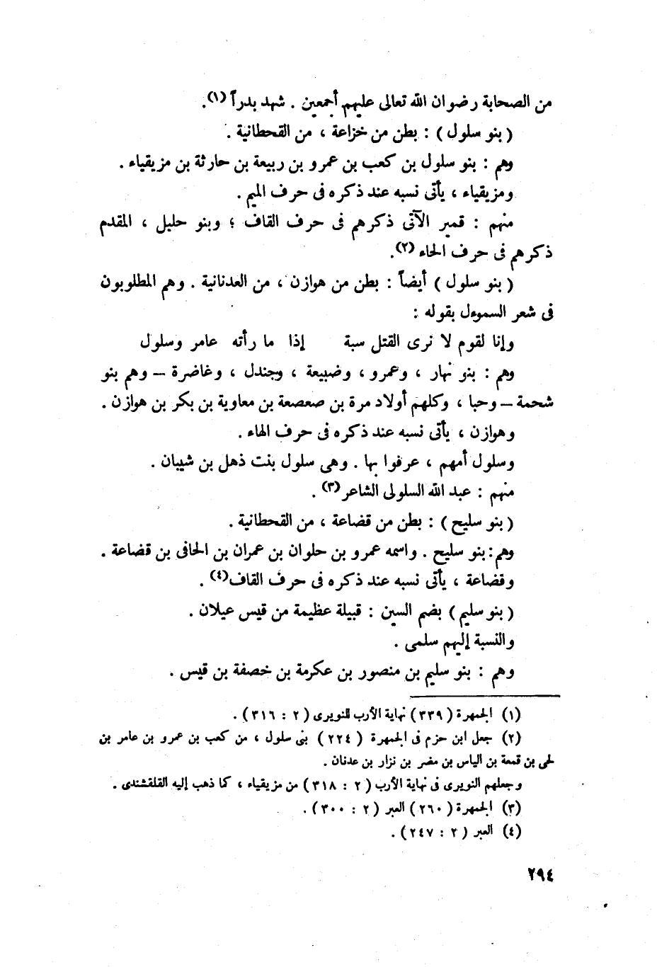 1048 - بنو سلول - أيضا ً - بطن من خزاعة من القحطانية، وهم بنو سلول بن كعب بن عمرو بن ربيعة بن حارثة بن مزيقيا، ومزيقيا يأتي نسبه عند ذكره في حرف الميم، منهم بنو قمير الآتي ذكرهم في حرف القاف، وبنو حليل المقدم ذكرهم في حرف الحاء المهملة، وبنو ضاطر الآتي ذكرهم في حرف الضاد.
