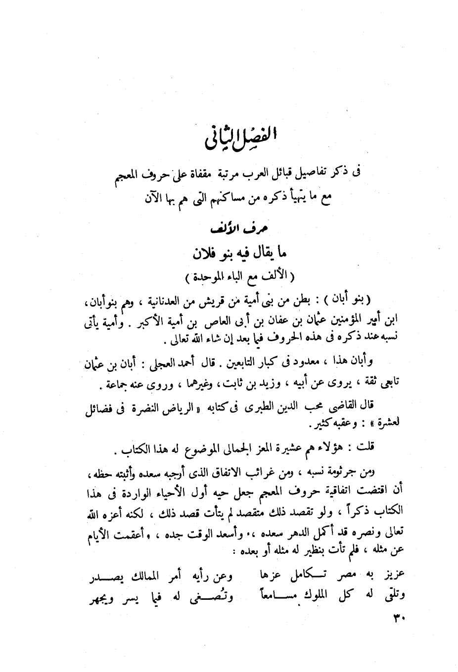 1 - بنو أبان بطن من بني أمية من قريش من العدنانية وهم بنو أبان بن أمير المؤمنين بن عفان بن أب يالعاص بن أمية الأكبر، وأمية يأتي نسبه عند ذكره في هذه الحروف فيما بعد إن شاء الله تعالى، وابان هذا معدود في كبار التابعين. قال أحمد بن العجلي: إبان بن عثمان تابعي ثقة روى عن أبيه وزيد بن ثابت وغيرهما، وروى عنه جماعة. قال الاضي محب الدين الطبري: في كتابه فضائل العشرة: وعقبه كثير قلت: وهؤلاء هم عشيرة المقري الجمالي الموضوع له هذا الكتاب ومن جرثومة نسبه ومن غرائب الاتفاق الذي أوجبه سعده واثبته حظه إن اقتضت اتفاقية حروف المعجم جعل حيه أول الأحياء الواردة في هذا الكتاب ذكراً ولو تقصد ذلك متقصد لم يتأت له لكنه أعز الله تعالى نصره قد أكمل الدهر سعده، وأسعد الوقت جده، واعقمت الأيام عن مثله فلم تأت بنظيره له مثله ولا بعده: