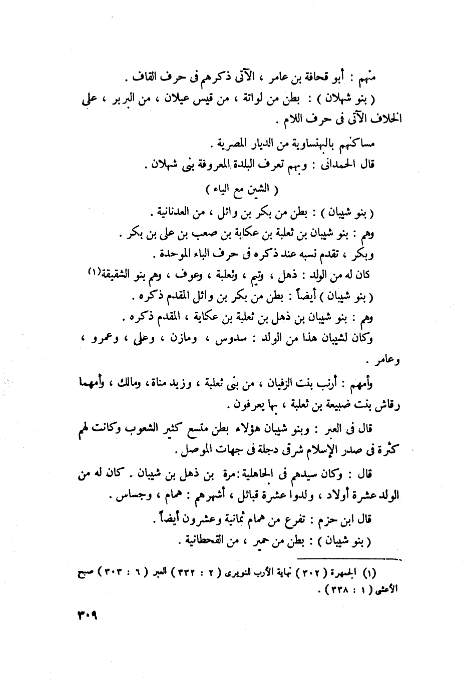 1115 - بنو شيبان - أيضاً - بطن من بكر من وائل المقدم ذكره، وهم بنو شيبان بن ذهل بن ثعلبة بن عكابة المقدم ذكره، وكان لشيبان هذا من الولد سدوس ومازن وعلي وعمرو وعامر وأمهم ارنب بنت الوقيان من بني ثعلبة. وزيد مناة ومالك، وامهما رقاش بنت ضبيعة بن قيس بن ثعلبة وبها يعرفون. قال في العبر: وبنو شيبان هؤلاء بطن متسع كثير الشعوب، وكانت لهم كثرة في صدر الاسلام شرقي دجلة في جهات الموصل. قال: وكان سيدهم في الجاهلية مرة بن ذهل بن شيبان، كان له من الولد عشرة اولاد، ولدوا عشر قبائل، أشهرهم همام وجساس، قال ابن حزم: تفرع من همام ثمان وعشرون بطناً.