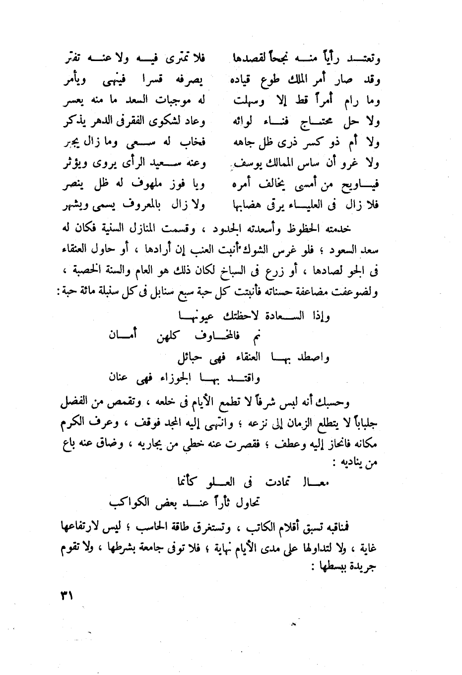 قد خدمته الحظوظ، وأسعدته الجدود، وقسمت المنازل الستة فكان له سعد السعود، فلو غرس الشوك أنبت العنب أين أرادها، أو حاول العنقاء في الجو لصادها، أو زرع في السباخ لكان ذلك هو العام والسنة الخصبة، ولضوعفت مضاعفة حسناته فأنبتت كل حبة، سبع سنابل في كل سنبلة مائة حبة: