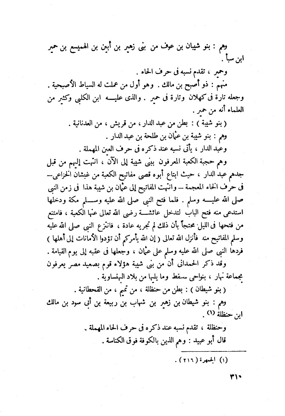 1117 - بنو شيبة - بطن من عبد الدار من قريش من العدنانية، وهم بنو شيبة بن عثمان بن طلحة بن عبد الدار، وعبد الداي يأتي نسبه عند ذكره في حرف العين المهملة، وهم حجبة الكعبة المعروفون بني شيبة الى الآن، انتهت اليهم من قبل جدهم عبد الدار حيث ابتاع ابوه قصي مفاتيح الكعبة من غبشان عتبان الخزاعي بزق خمر على ما تقدم في الكلام على خزاعة في حرف الخاء المعجمة، وانتهت المفاتيح الى عثمان بن شيبة هذا في زمن النبي صلى الله عليه وسلم فلما فتح النبي صلى الله عليه وسلم مكة ودخلها استدعى منه فتح الباب ليلا ليدخل عائشة الكعبة، فامتنع من فتحها في الليل محتجا بأن ذلك لم تجربه عادة، فانتزع النبي صلى الله عليه وسلم المفاتيح منه فانزل الله تعالى " إن الله يامركم أن تؤدوا الامانات الى أهلها " فردها النبي صلى الله عليه وسلم على عثمان وجعلها في عقبه الى يوم القيامة، وقد ذكر الحمداني: ان من بني شيبة هؤلاء قوم بصعيد مصر يعرفون بجماعة نهار بنواحي سفط وما يليها من بلاد البهنساوية.