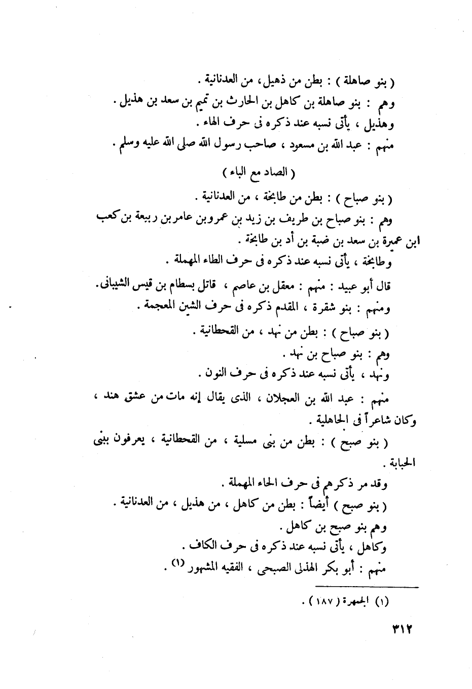 1127 - بنو صبح - أيضاً - بطن من كاهل من هذيل من العدنانية، وهم بنو صبح بن كاهل وكاهل يأتي نسبه عند ذكره في حرف الكاف، منهم أبو بكر الهذلي الصبيحي الفقيه المشهور.