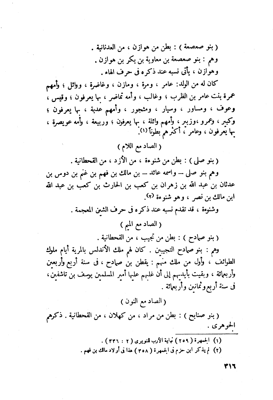 1142 - بنو صعصعة - بطن من هوازن من العدنانية، وهم بنو صعصعة ابن حارثة بن معاوية بن بكر بن هوازن، وهوازن يأتي نسبه عند ذكره في حرف الهاء، كان له من الولد عامر ومرة ومازن وعامر وائل، وأمهم عمرة بنت عامر ابن الطرب الضرب، وغالب وأمه غاضرة، وبها يعرفون، وقيس وعوف ومساور وسيار ومثجور، وأمهم عدية وبها يعرفون، وكبيرة وزبينة وأمهم واثلة وبها يعرفون، وربيعة وأمه غويصرة وبها يعرفون، وعامر أكثرهم بطوناً.
