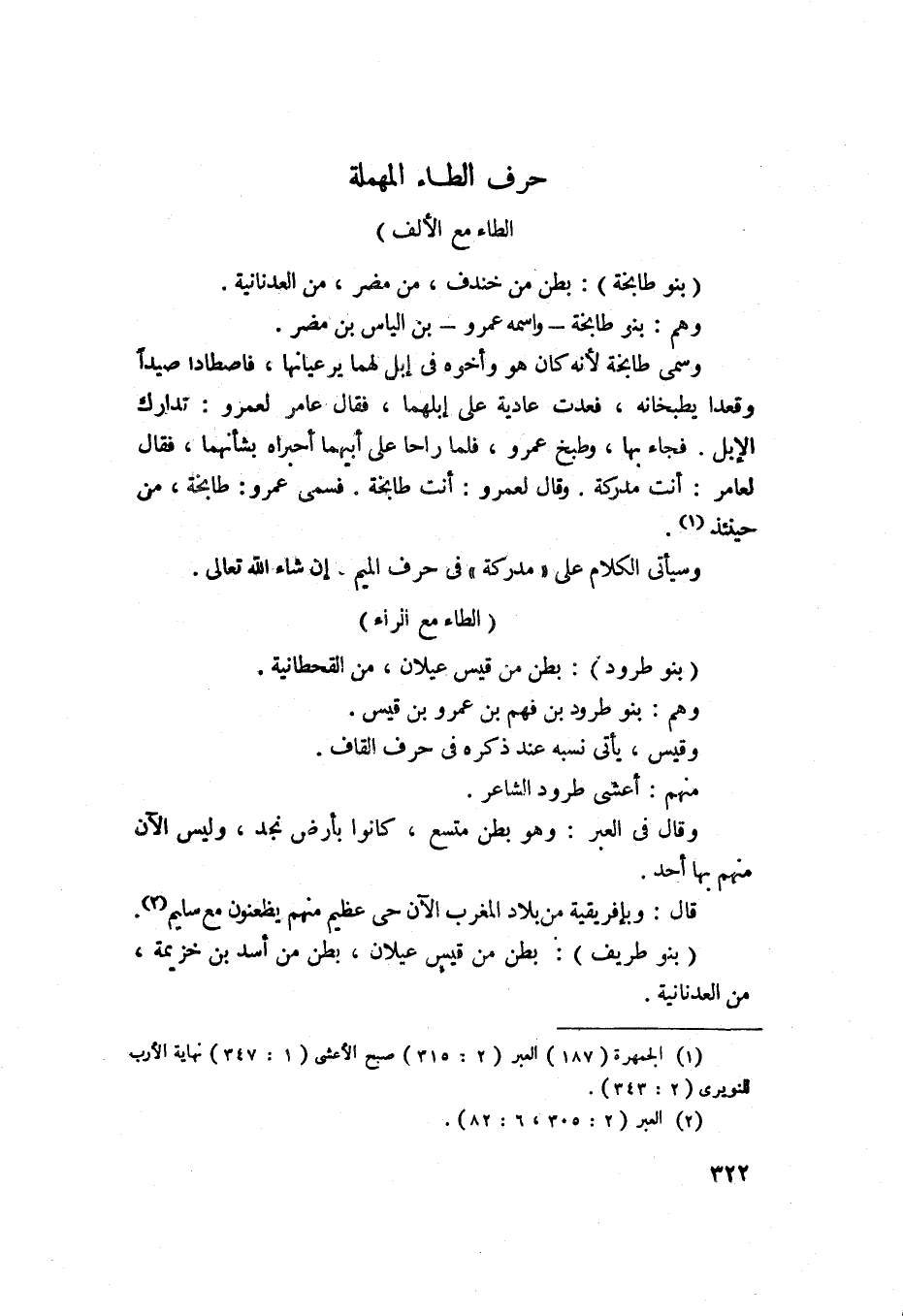 1161 - بنو طابخة - بطن من خندف من مضر من العدنانية، وهم بنو طابخة وأسمه عمرو بن الياس بن مضر، وسمي طابخة لأنه كان هو وأخوه عامر في أبل لهما يرعيانها فاصطادوا صيداً وقعداً يطبخانه فعدت عادية على أبلهما فقال عامر لعمر وتدارك الأبل فجاء بها وطبخ عمرو، فلما راحا على أبيهما أخبراه بشأنهما فقال لعامر: أنت مدركة، وقال لعمرو أنت طابخة: فسمي عمرو طابخة من حينئذ، وسيأتي الكلام على مدركة في حرف الميم أن شاء الله تعالى.