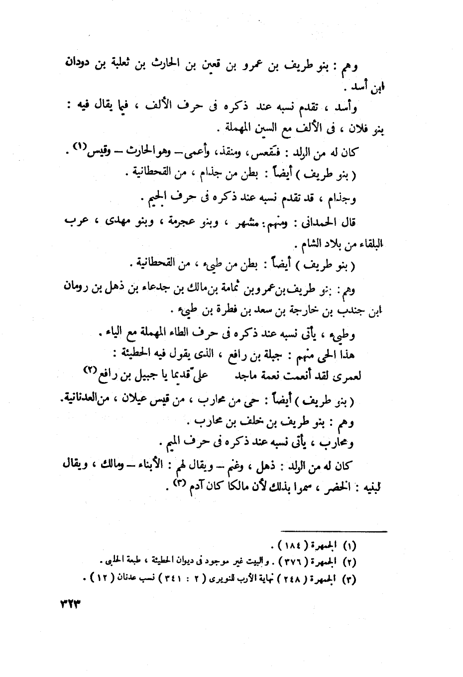 1164 - بنو طريف - بطن من جذام من القحطانية، وجذام قد تقدم نسبه عند ذكره في حرف الجيم، قال الحمداني: ومنهم بنو مهر وبنو عجرمة وبنو مهدي عرب البلقاء من بلاد الشام.