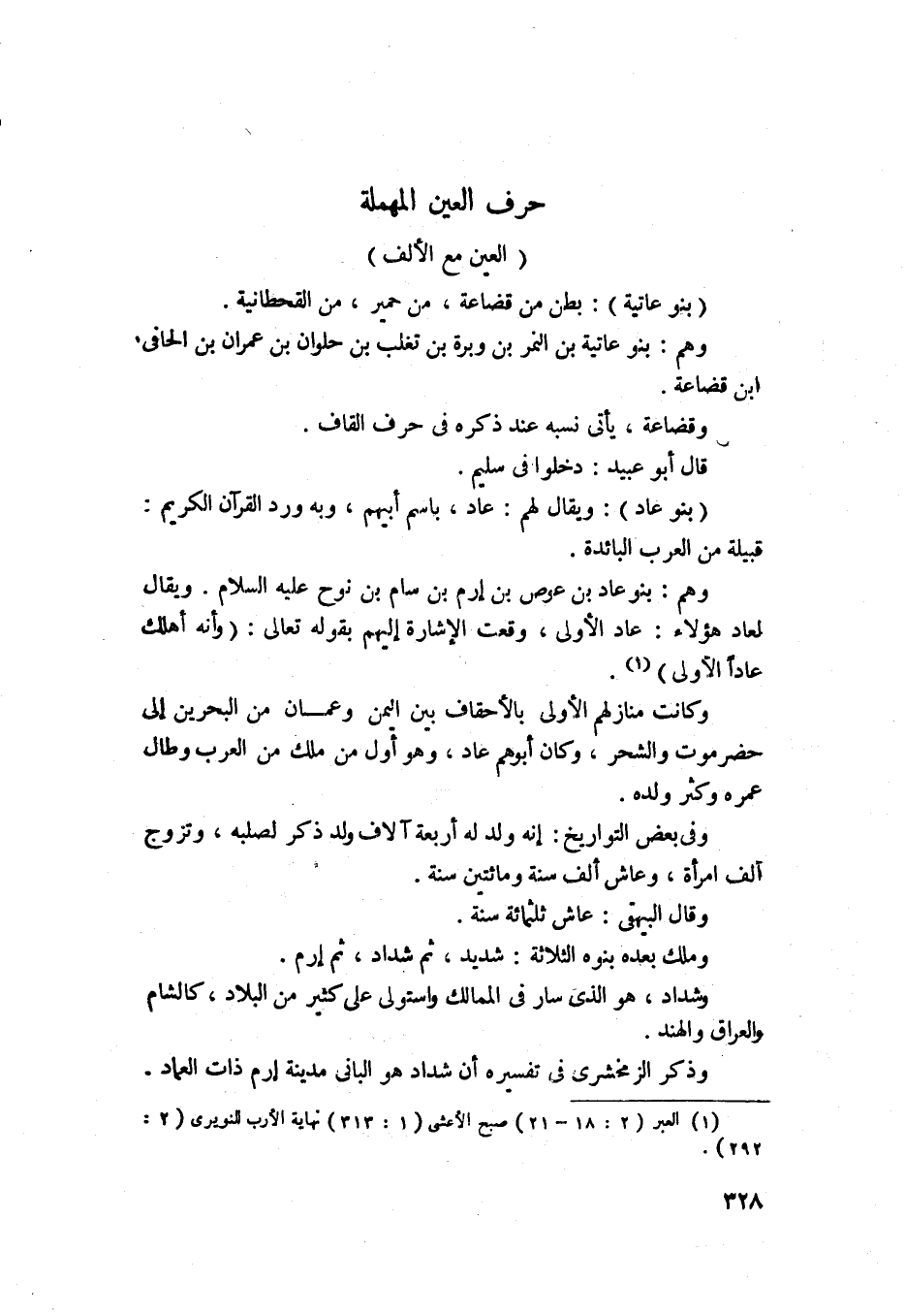 1178 - بنو عاد - ويقال لهم عاد باسم ابيهم وبه ورد القرآن الكريم قبيلة من العرب العاربة والبائدة، وهم بنو عاد بن عوص بن أرم بن سام بن نوح عليه السلام، ويقال لعاد هؤلاء عاد الأولى، وإليه وقعت الأشارة بقوله: " وأنه أهلك عادا الأولى " وكانت منازلهم بالأحقاف بين اليمن وعمان من البحرين إلى حضرموت والشحر، وكان أبوهم عاد فيما يقال: أول من ملك من العرب وطال عمره وكثر ولده، وفي بعض التواريخ أنه ولد له أربعة آلاف ولد ذكر لصلبه، وتزوج ألف امرأة، وعاش ألف سنة ومائتين سنة، وقال البيهقي: عاش ثلثمائة سنة وملك بعده بنوه الثلاثة شديد ثم شداد ثم أرم، وشداد هو الذي سار في المالك واستولى على كثير من البلاد كالشام والعراق والهند، وذكر الزمخشري في تفسيره: أن شداد هو الباني مدينة أرم ذات العماد،
