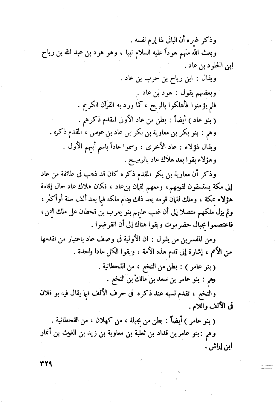 1179 - بنو عاد - أيضاً - بطن من عاد الأولى المقدم ذكرهم، وهم بنو بكر بن معاوية بن بكر بن عاد بن عوص المقدم ذكره، ويقال لهؤلاء عاد الأخرى، وسموا عاد بأسم أبيهم الأولى، وهؤلاء بقوا بعد هلاك عاد بالريح وذك أن معاوية بن بكر المقدم ذكره، كان قد ذهب في طائفة من عاد إلى مكة يستسقون لقومهم ومعهم لقمان بن عاد فكان هلاك عاد حال إقامة هؤلاء بمكة وملك لقمان قومه بعد ذلك، ودام ملكه فيما بعد ألف سنة أو أكثر، ولم يزل ملكهم متصل إلى أن غلب عليهم بنو يعرب بن قحطان على ملك اليمن فاعتصموا بجبال حضرموت وبقوا هناك إلى أن انقرضوا، ومن المفسرين من يقول أن الأولية في وصف عاد باعتبار من تقدمها من الأمم إشارة إلى قدم المة وبقوا الكل عاد واحدة.