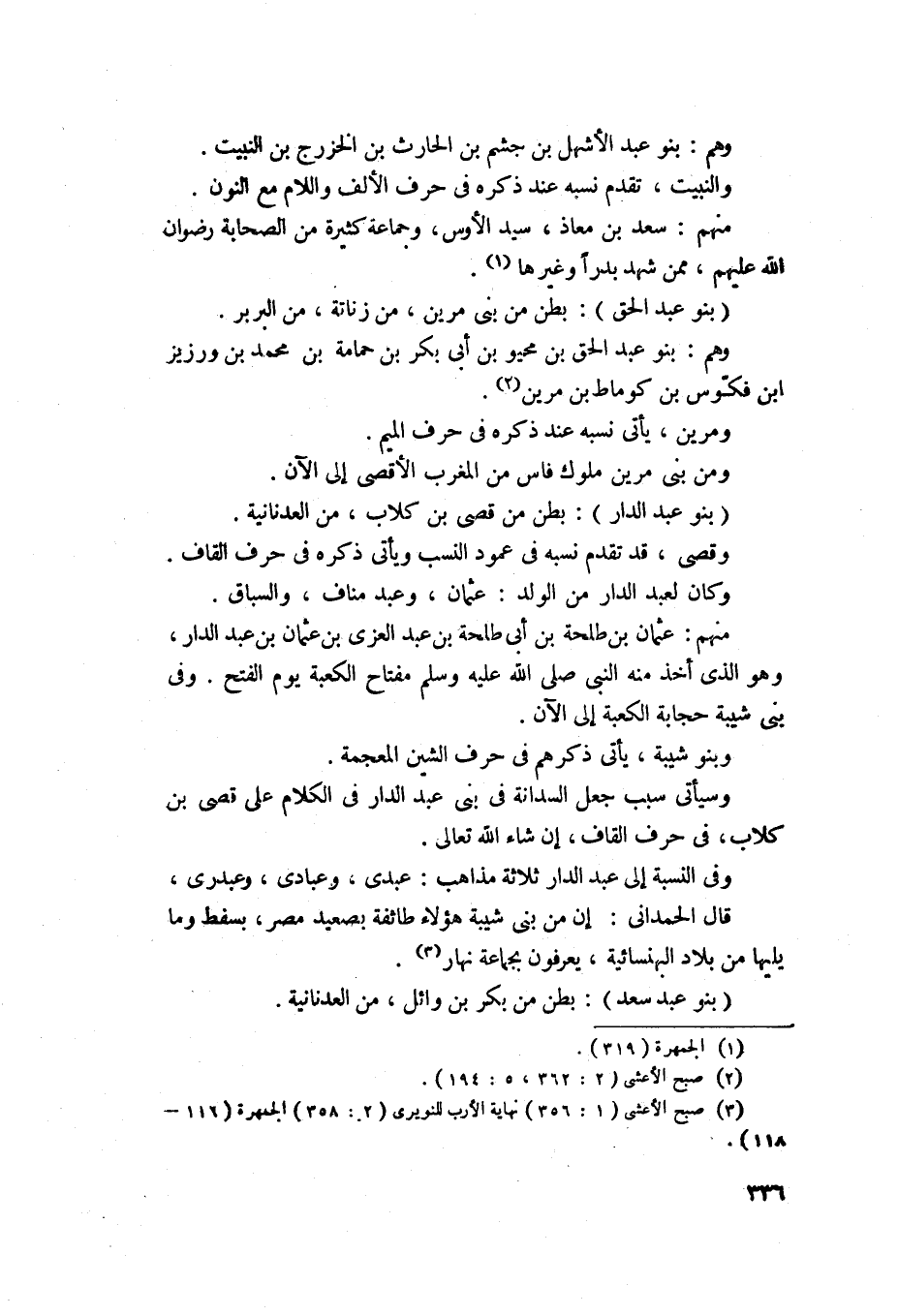 1209 - بنو عبد الدار - بطن من قصي بن كلا ب من العدنانية، وقصي قد تقدم نسبه في عمود النسب ويأتي ذكره في حرف القاف، وكان لعبد الدار من الولد عثمان بن طلحة ابن عبد العزى بن عثمان بن طلحة بن ابي طلحة ابن عبد العزى بن عثمان بن عبد الدار، وهو الذي اخذ منه النبي صلى الله عليه وسلم. مفاتيح الكعبة يوم الفتح، وفي بني شيبة حجابة الكعبة الى الان، على ما تقدم في الكلام على بني شيبة وبنو شيبة قد مر ذكرهم في حرف الشين المعجمة، وسيأتي سبب جعل السدانة في بني عبد الدار في الكلام على قصي بن كلاب في حرف القاف إن شاء الله تعالى، وفي النسبة إلى عبد الدار ثلاثة مذاهب عبدي وعبادي وعبدري، قال الحمداني: وكانت طائفة منهم.