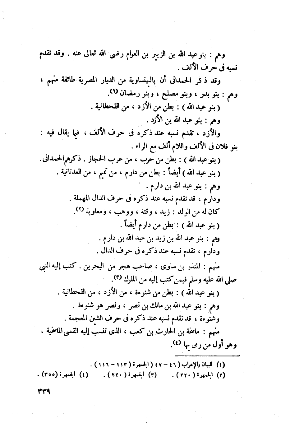 1219 - بنو عبد الله بطن من دارم ايضا، وهم بنو عبد الله بن زيد بن عبد الله بن دارم ودارمتقدم نسبه عند ذكره، منهم المنذر بن ساوي صاحب هجر من البحرين كتب اليه النبي صلى الله عليه وسلم فيمن كتب إليه من الملوك 1220 - بنو عبد الله بطن من شنؤة من الأزد من القحطانيه وهم بنو عبد الله بن مالك بن نصر، ونصر هو شنؤة وقد تقدم نسبه عند ذكره في حرف الشين المعجمه منهم ماسخه بن كعب الذي تنسب إليه القسي الماسخيه وهو أول من رمى بها