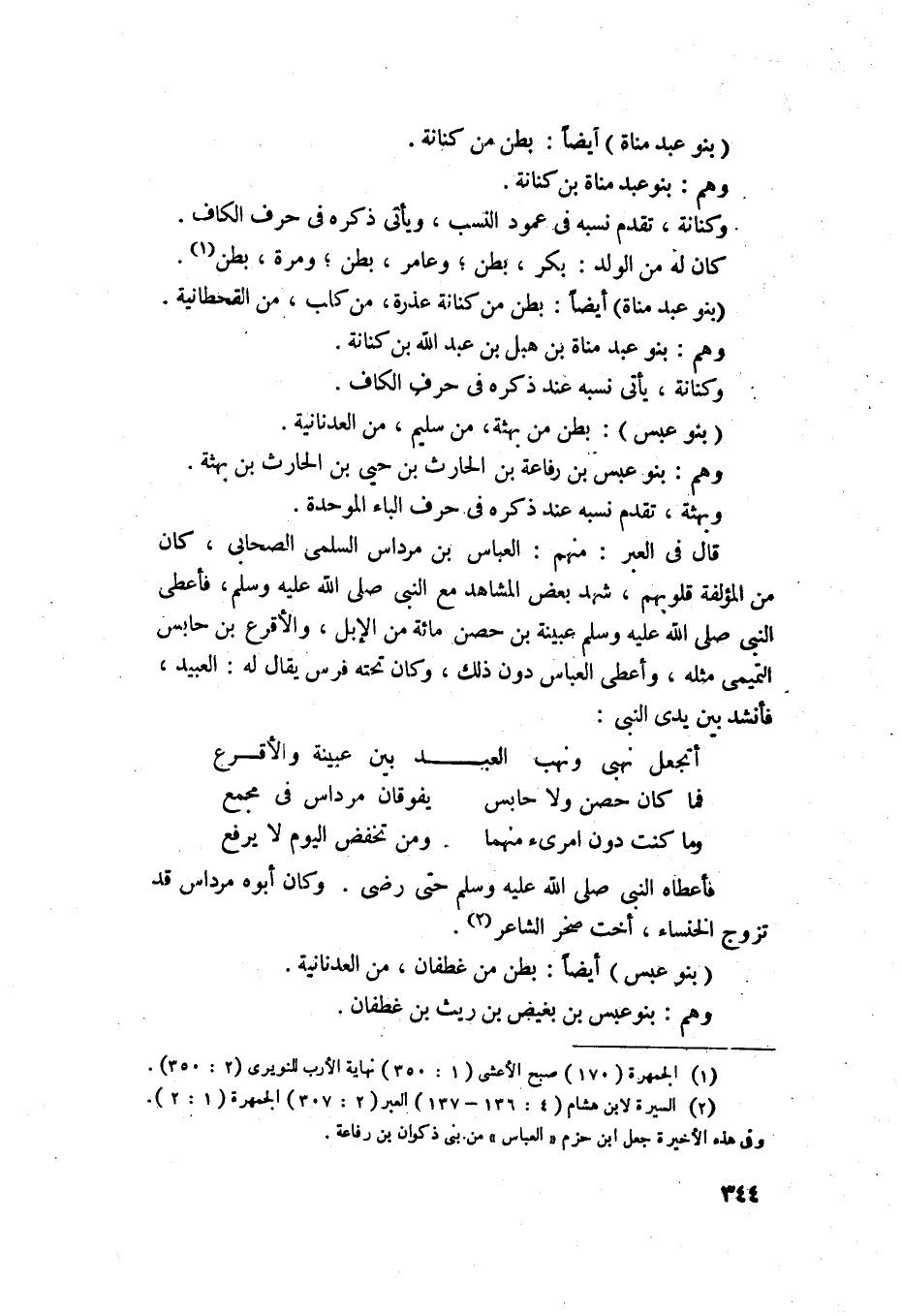 1241 - بنو عبس - بطن من بهتة من سليم من العدنانية، وهم بنو عبس ابن رفاعة بن الحارث بن حبي بن الحارث بن بهتة وبهتة تقدم نسبه عند ذكره في حرف الباء الموحدة. قال في العبر: منهم العباس بن مرداس السلمي كان من المؤلفة قلوبهم شهد بعض المشاهد مع النبي صلى الله عليه وسلم فأعطى النبي صلى الله عليه وسلم عتبة ابن حصين مائة من الأبل، والأقرع بن حابس التميمي مثله، وأعطى العباس دون ذلك، وكان تحته فرس يقال له العبيد، فأنشد بين يدي النبي صلى الله عليه وسلم هذه الأبيات: