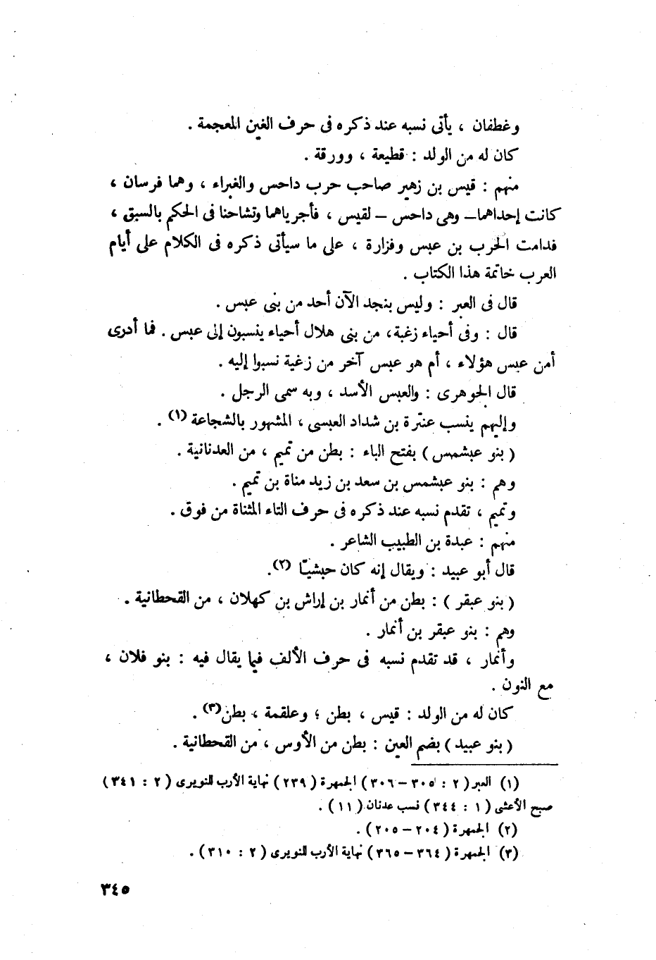 وغطفان يأتي نسبه عند ذكره في حرف الغين المعجمة، كان له من الولد قطيعة وورقة، منهم زهير بن قيس صاحب حرب داحس والغبير وهما فرسان، كانت أحداهما وهي داحس لقيس والأخرى وهي الغبرا لحذيفة بن بدر سيد فزارة فاجرياهما وتشاحنا في الحكم بالسبق، وقتل قيس حذيفة، فدامت الحرب بين عبس وفزارة على ما سيأتي ذكره في الكلام على أيام العرب في خاتمة هذا الكتاب. قال في العبر: وليس بنجد الآن أحد من بني عبس. قال: وفي أحياء عتبة من بني هلال أحياء ينسبون إلى عبس فلا أدري أهو عبس هذا أم عبس آخر من زغبة. قال الجوهري: والعبس الأسد وبه سمي الرجل وإليهم ينسب عنترة بن شداد العبسي المشهور بالشجاعة.