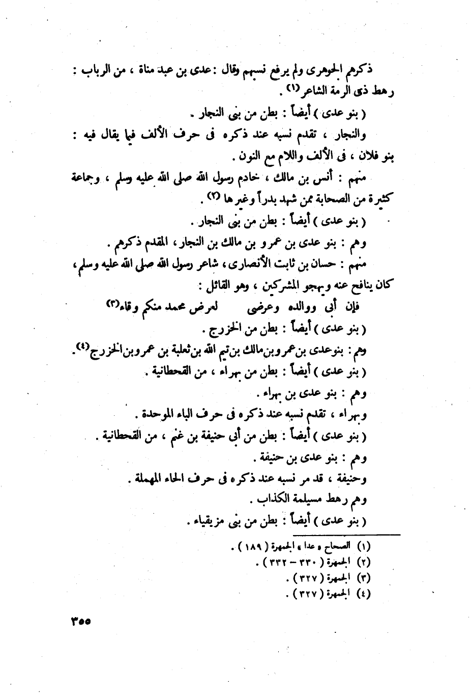 1277 - بنو عدي - أيضاً - بطن من بني النجار، والنجار يأتي نسبه عند ذكره في حرف الالف فيما يقال فيه بنو فلان في الالف واللام مع النون منهم أنس بن مالك خادم رسول الله صلى الله عليه وسلم وجماعة كثيرة. من الصحابة ممن شهد بدراً وغيرها.