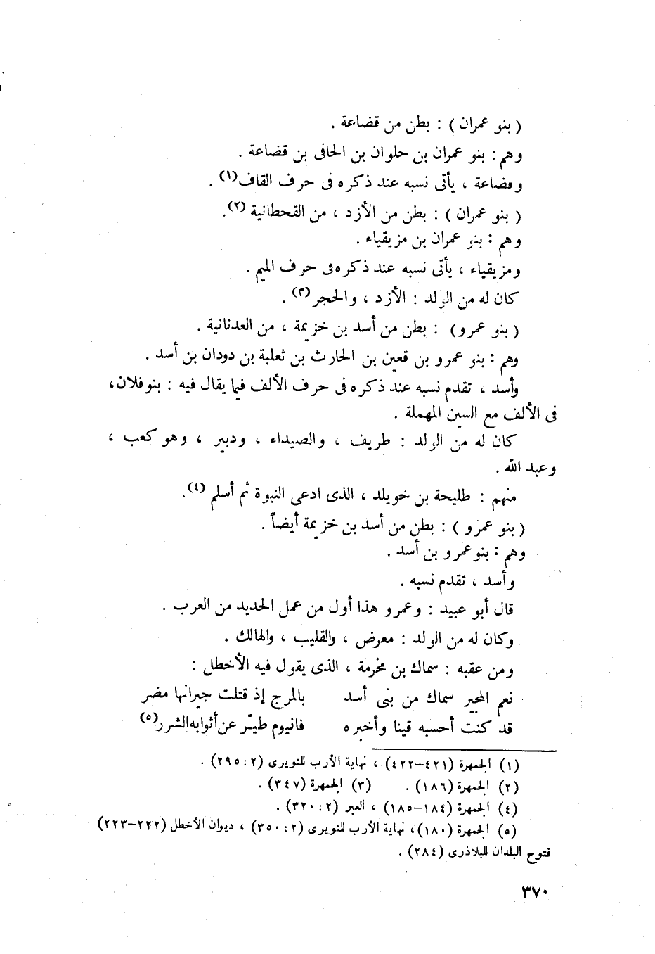 1338 - بنو عمرو - بطن من أسد بن خزيمة أيضاً، وهم بنو عمرو بن أسد وأسد تقدم نسبه. قال أبو عبيد: وعمرو هذا أول من عمل الحديد من العرب، وكان له من الولد المسيب ووهيم وهم ومعوض والقليب والمطيح والحاشم والحالك، ومن عقبة سماك بن محرمة الذي يقول فيه الاخطل:
