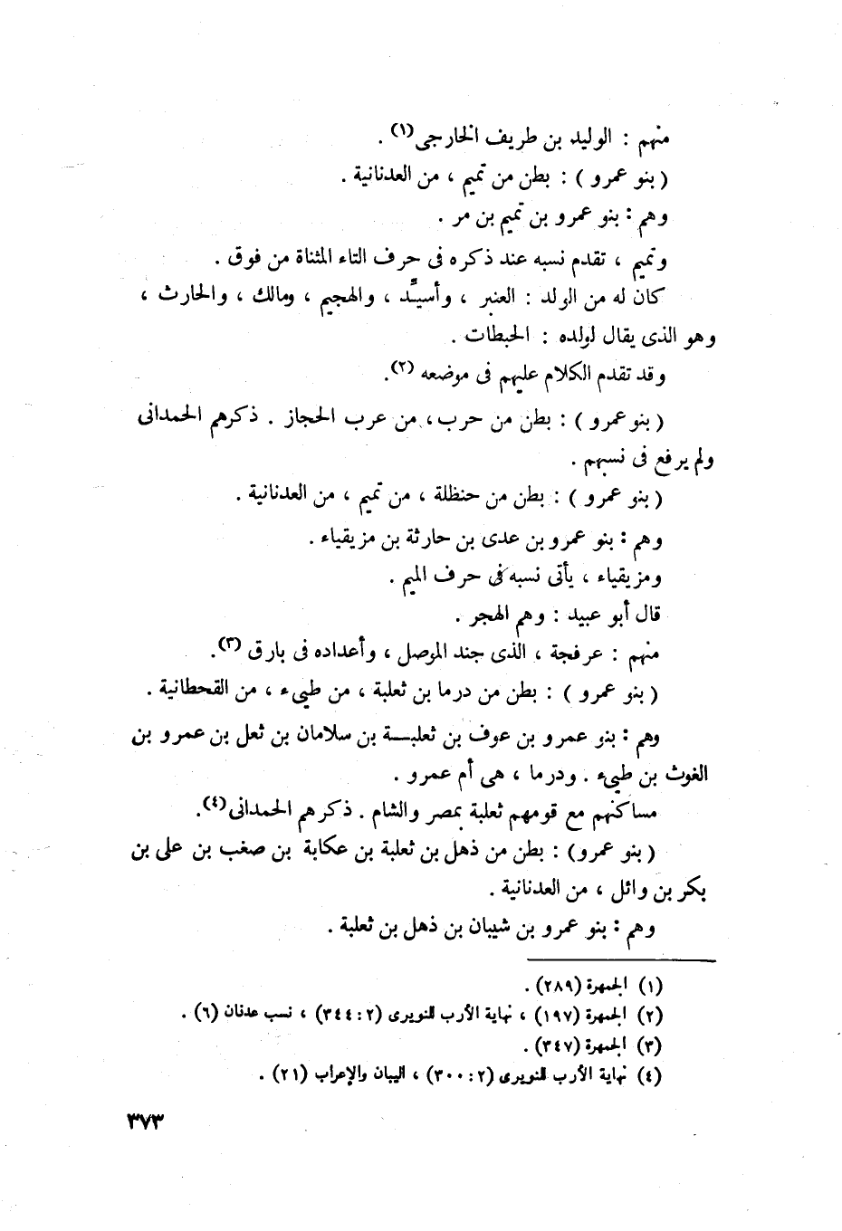 1353 - بنو عمرو - أيضاً - بطن من ذهل بن ثعلبة بن بكر بن وائل من العدنانية، وهم بنو عمرو بن شيبان بن ذهل بن ثعلبة،