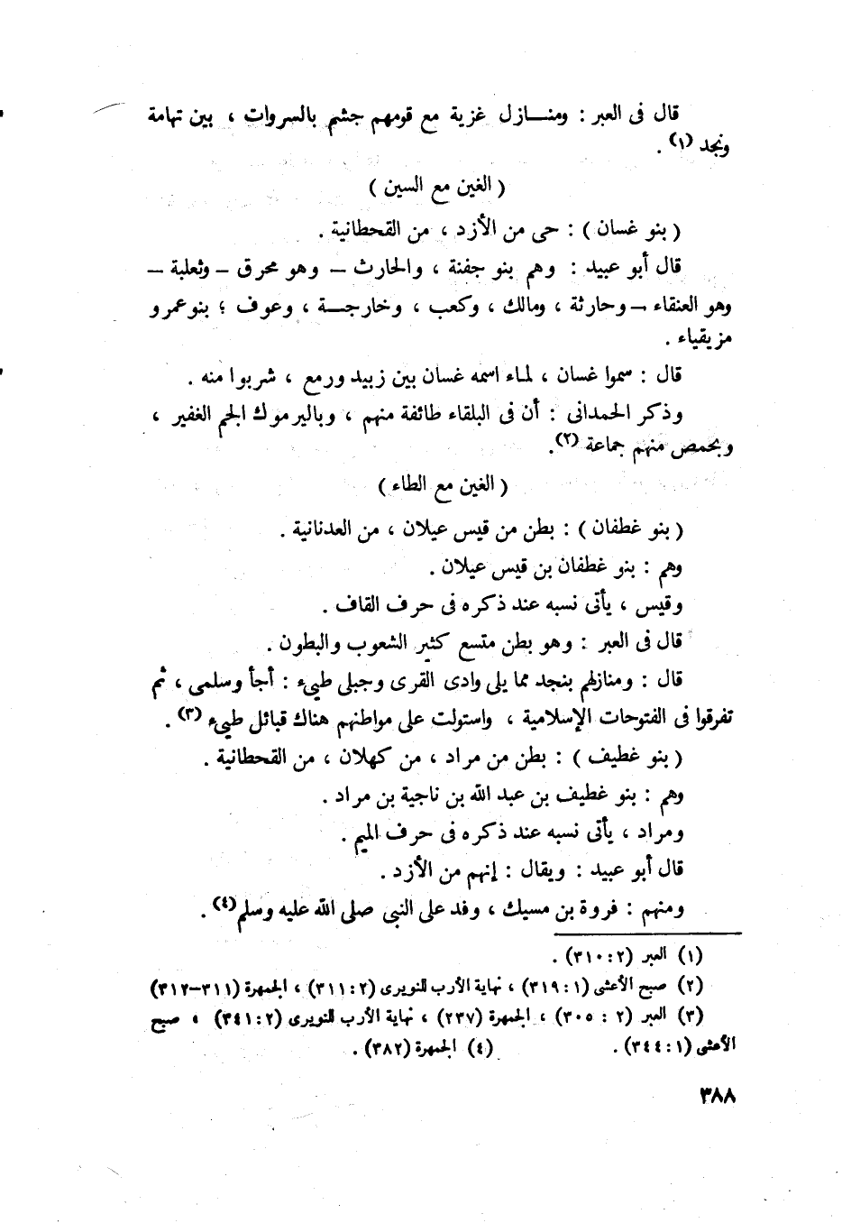 1422 - بنو غطفان - بطن من قيس عيلان من العدنانية، وهم بنو غطفان ابن سعد بن قيس بن عيلان، وقيس يأتي نسبه عند ذكره في حرف القاف. قال في العبر: وهو بطن من متسع كثير الشعوب والبطون. قال ومنازلهم مما يلي وادي القرى وجبلي طي اجاء وسلمى، ثم تفرقوا في الفتوحات الاسلامية واستولى على مواطنهم هناك قبائل طي.