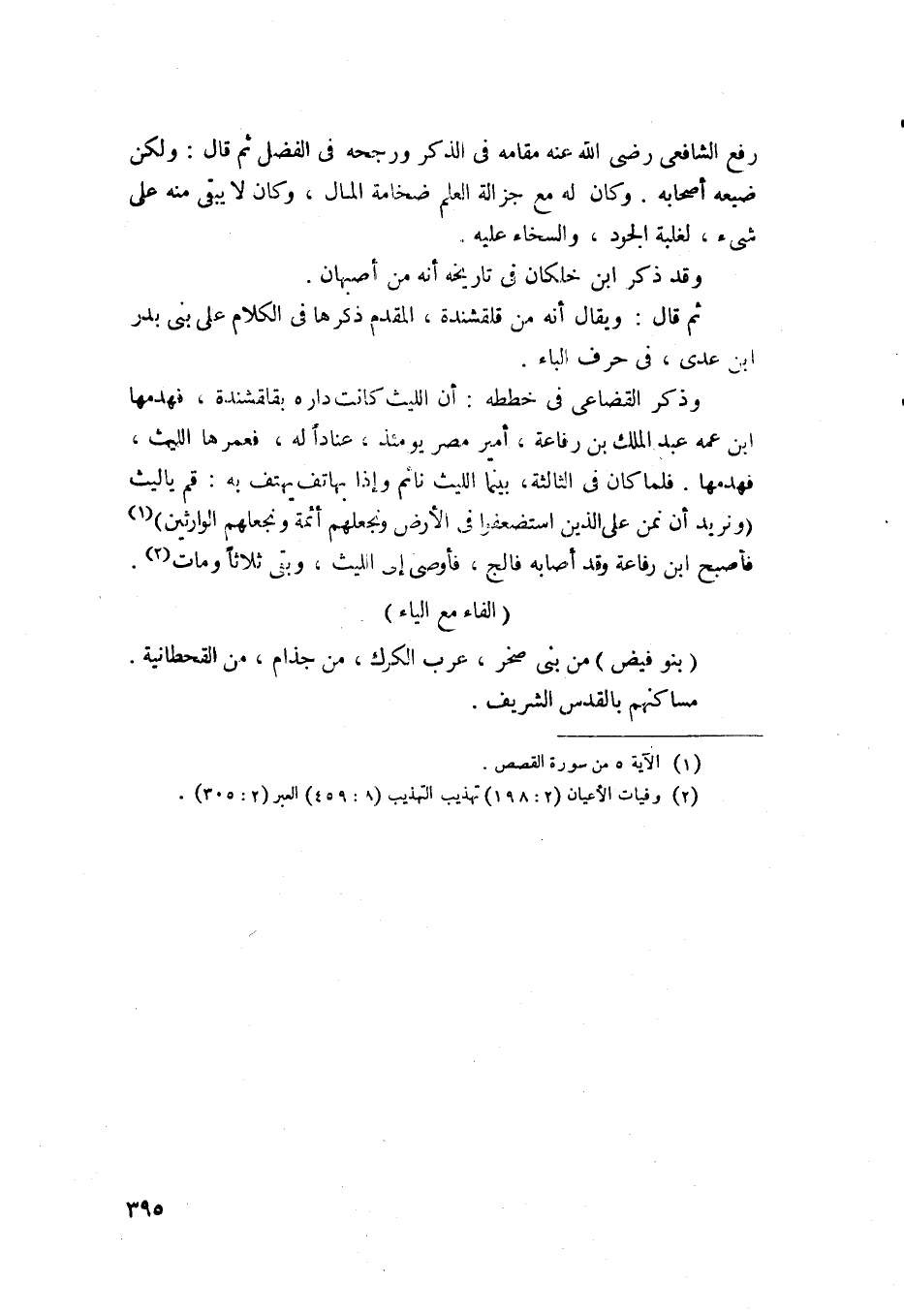 رفع الشافعي مقامه في الذكر، ورجحه في الفضل، ثم قال: ولكن ضيعه أصحابه، وكان له من جزالة العلم ضخامة المال، وكان لا يبقى منه على شيء لغلبة الجود والسخاء عليه، وقد ذكر ابن خلكان في تاريخه أنه من أصبهان، ثم قال: ويقال انه من قلقشند المقدم ذكرها في حرف الباء في الكلام على بني بدر بن عدي، وذكر القاضي في خططه: انه كان الليث داره بقلقشندة فهدمها ابن عمه عبد الملك بن رفاعة أمير مصر يومئذ عناداً له فعمرها الليث فهدمها، فعمرها فهدمها، فلما كان في الثالثة بينما الليث نائم واذا بهاتف يهتف به قم يا ليث ونريد أن نمن على الذين استضعفوا في الأرض ونجعلهم أئمة ونجعلهم الوارثين فأصبح ابن رفاعة وقد أصابه فالج فأوصى إلى الليث وبقي ثلاثاً ومات.