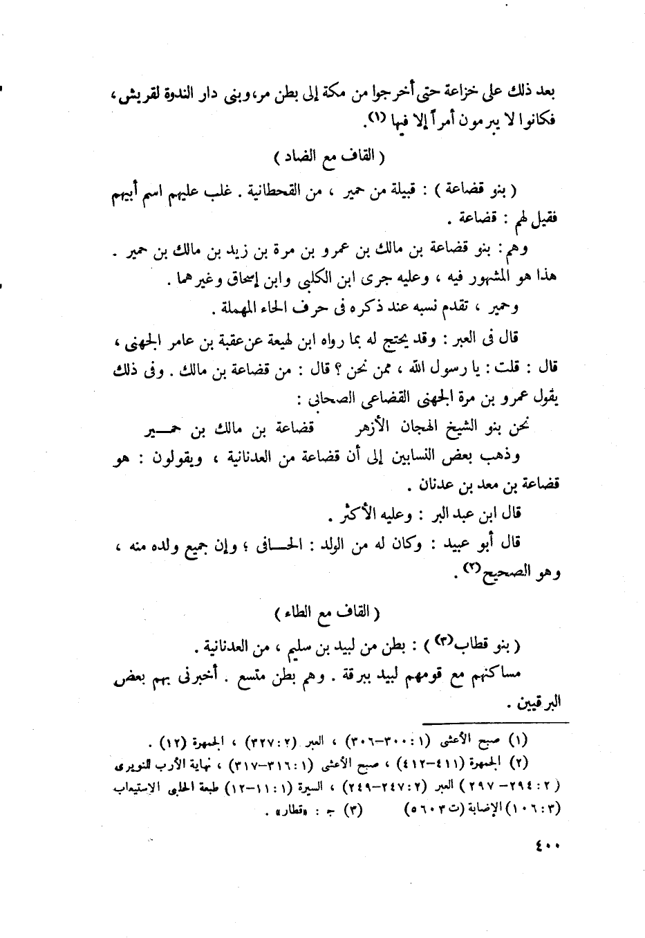1460 - بنو قضاعة - قبيلة من حمير من القحطانية، غلب عليهم اسم ابيهم فقيل لهم قضاعة، وهم بنو قضاعة بن مالك بن عمرو بن مرة بن زيد بن مالك بن حمير هذا هو المشهور فيه، وعليه جرى ابن الكلبي وابن اسحاق وغيرهما، وحمير تقدم نسبه عند ذكره في حرف الحاء المهملة. قال في العبر: وقد يحتج له بما رواه بن لهيعة بن عامر الجهني. قال: قلت يا رسول الله ممن يمن قال من قضاعة بن مالك، وفي ذلك يقول عمرو بن القضاعي الصحابي.