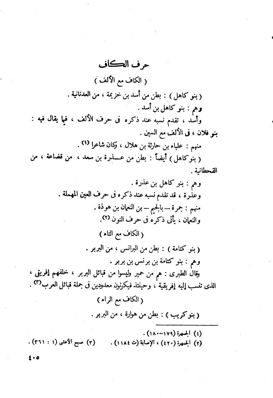 1480 - بنو كتامة - بطن من البرانس من البربر، وهم بنو كتامة بن برنس ابن بربر وقال الطبري: هم من حمير وليسوا من قبائل البربر خلفهم افريقس الذي ينسب اليه افريقية، وحينئذ فيكونون معدودين في جملة قبائل العرب.