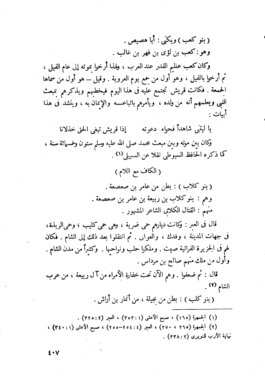 1488 - بنو كعب - ويكنى أبا هصيص، وهو كعب بن لوي بن فهر بن غالب، وكان كعب عظيم القدر عند العرب، ولهذا أرخوا لموته إلى عام الفيل، ثم أرخوا بالفيل. وهو أول من جمع يوم العروبة، وقيل هو أول من سماها الجمعة، فكانت قريش تجتمع عليه في هذا اليوم فيخطبهم ويذكرهم بمبعث النبي صلى الله عليه وسلم ويعلمهم انه من ولده ويأمرهم باتباعه والايان به وينشد في هذا ابيات: