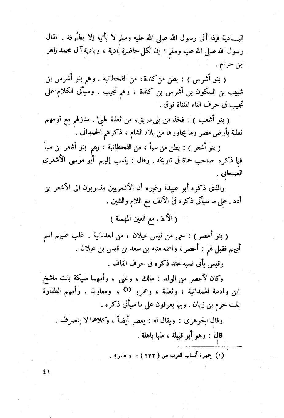 43 - بنو أشعر - بطن من سبأ من القحطانية، وهم بنو أشعر بن سبأ فيما ذكره صاحب حماة في تأريخيه وقال: ينسب اليهم أبو موسى الأشعري الصحابي، والذي ذكره أبو عبيدة وغيره أن الاشعريين منسوبون إلى الأشعر بن أدد، على ما سيأتي ذكره في الألف مع اللام والشين.